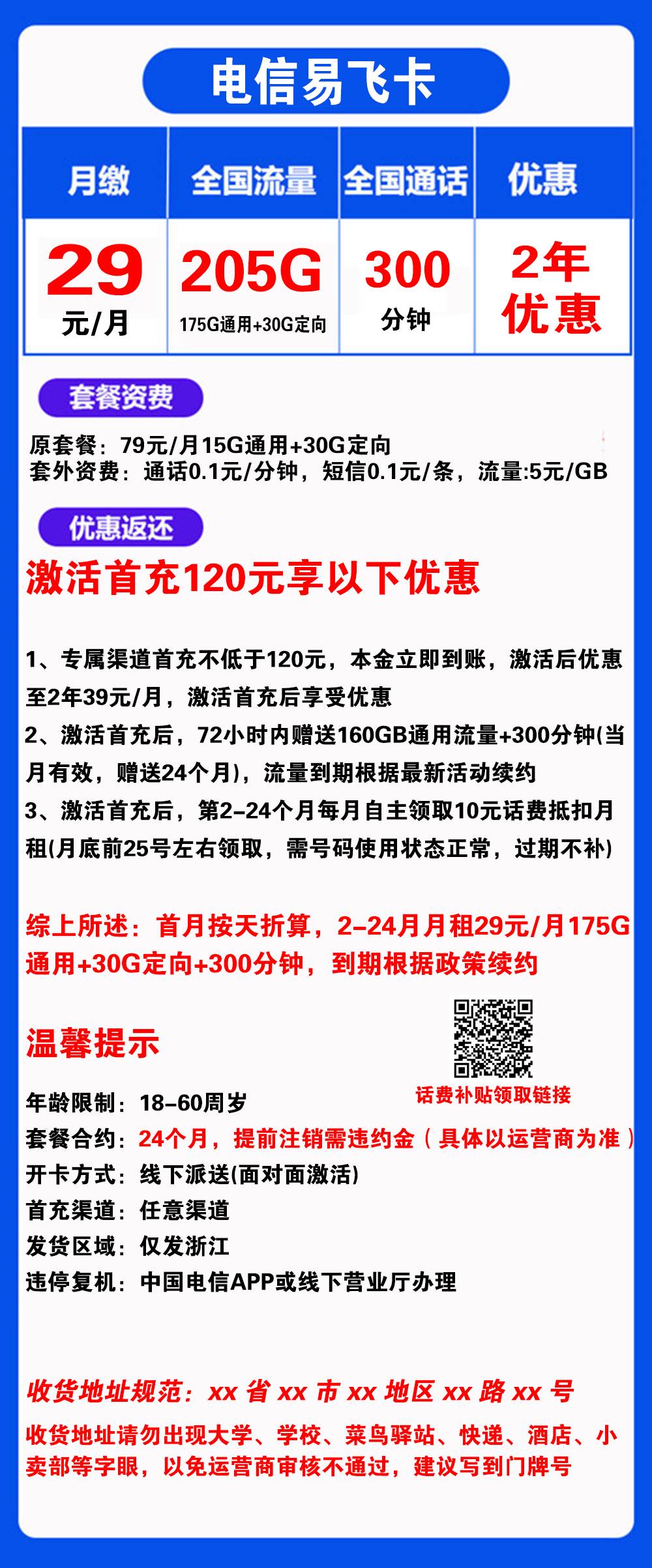 K1687/电信易飞卡29元205G流量+300分钟通话【仅发浙江】
