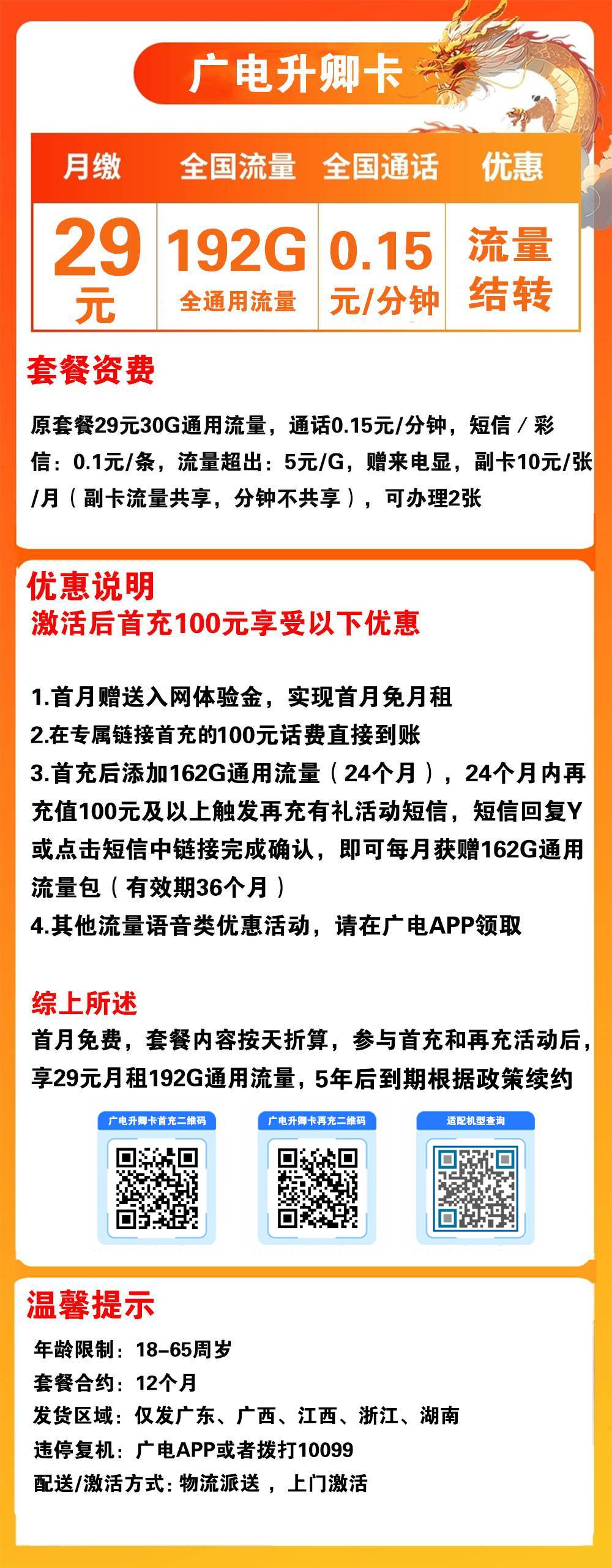 - 参与首充和再充活动后,享29元月租,192G通用流量