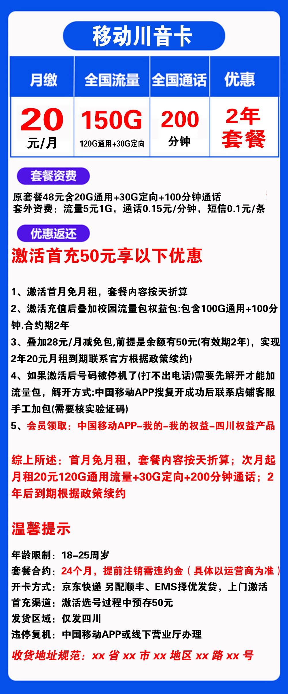 H1698/移动川音卡20元150G流量+200分钟通话【仅发四川】