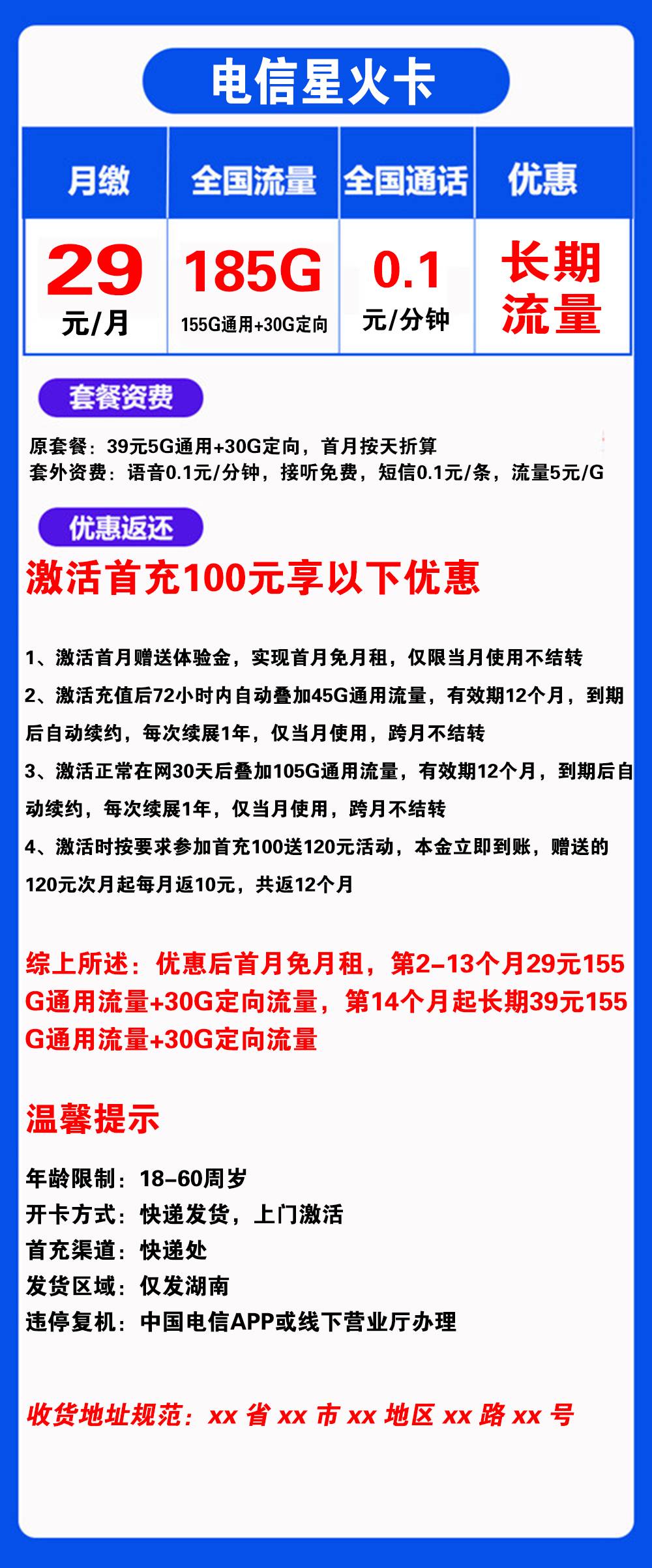 D1705/电信星火卡29元185G流量+0.1元/分钟通话【仅发湖南】【长期流量】