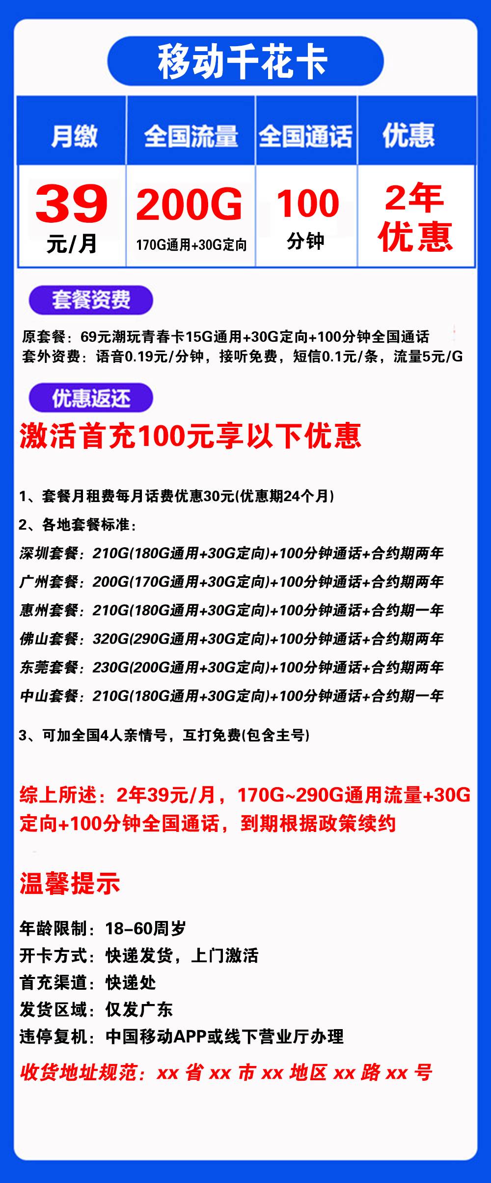 F1712/移动千花卡39元200G流量+100分钟通话【仅发广东】