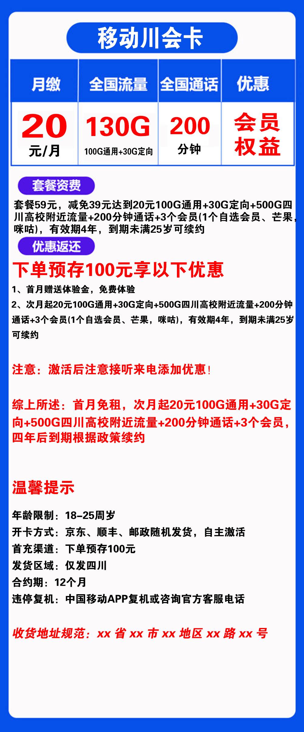 - 首月免租,次月起20元100G通用+30G定向+500G四川高校附近流量+200分钟通话+3个会员