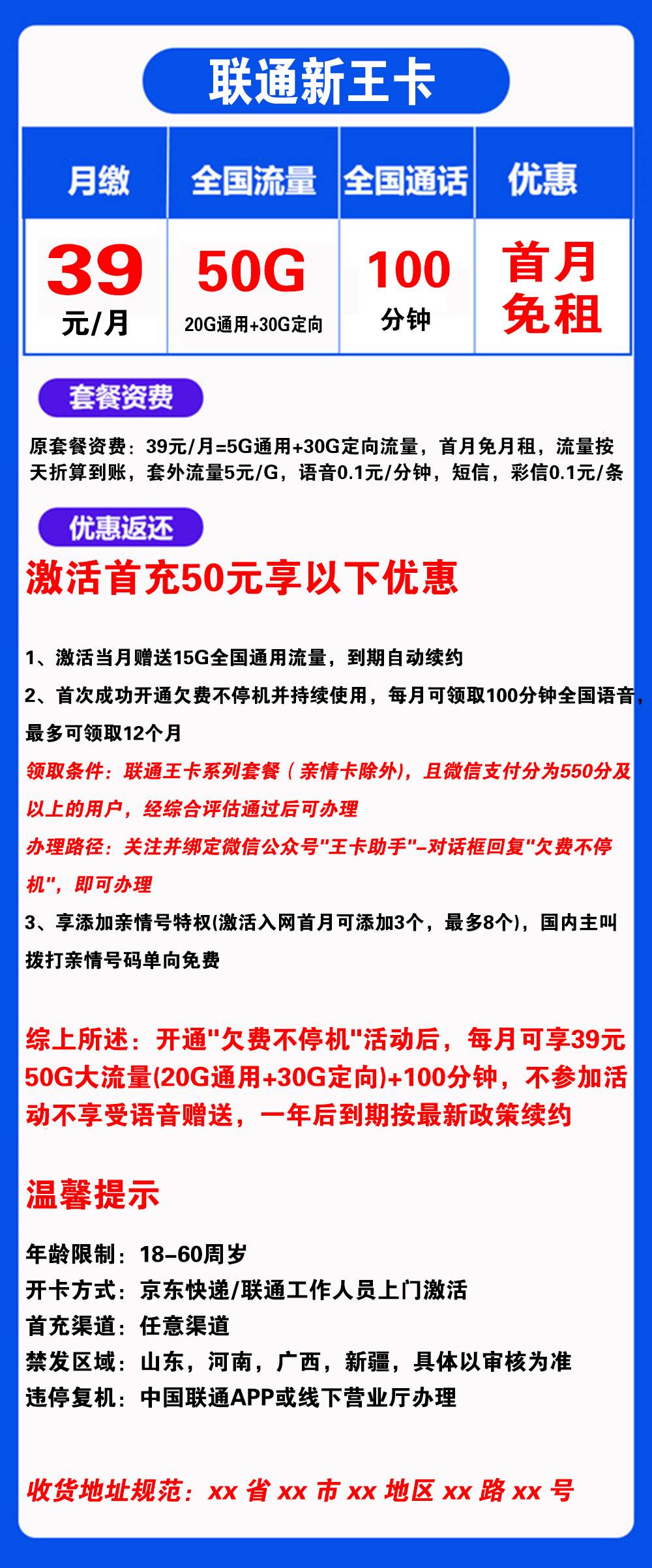 F1708/联通新王卡39元50G流量+100分钟【发全国】