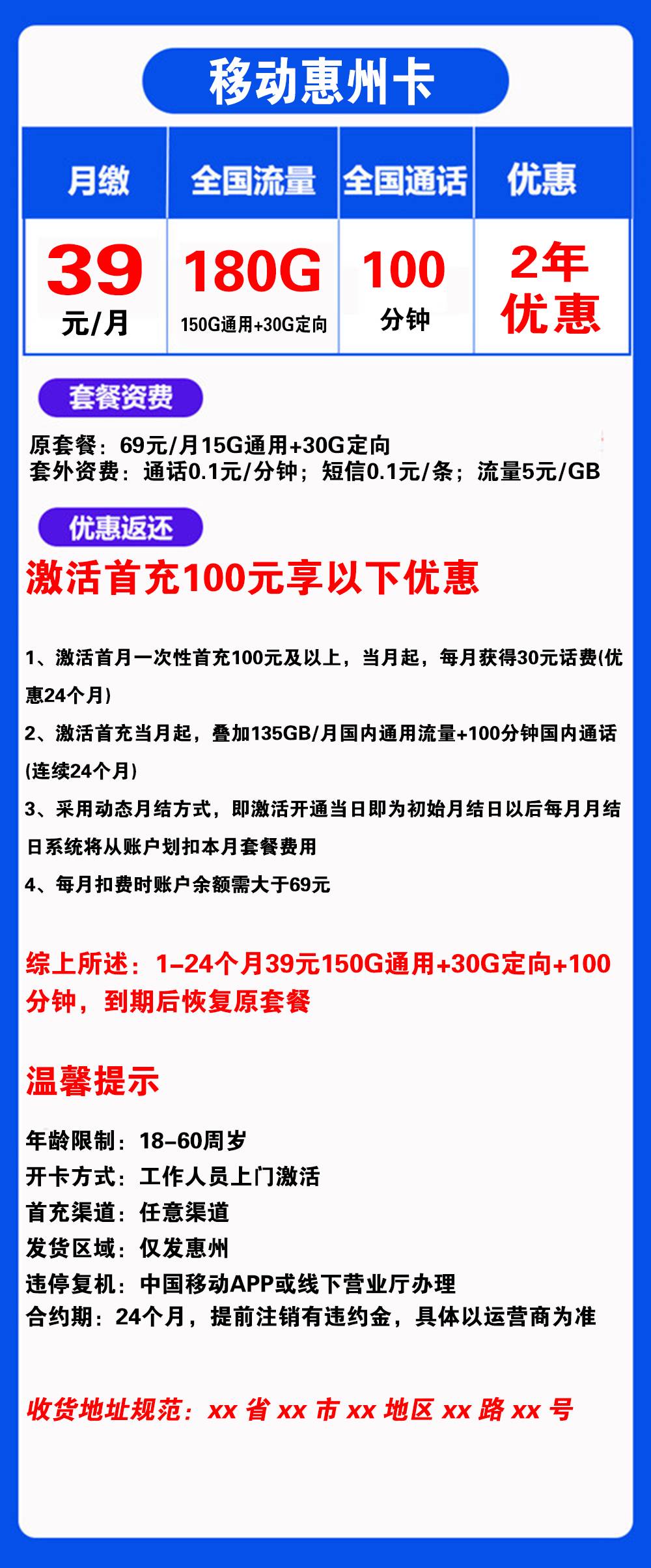K1719/移动惠州卡39元180G流量+100分钟通话【仅发惠州】