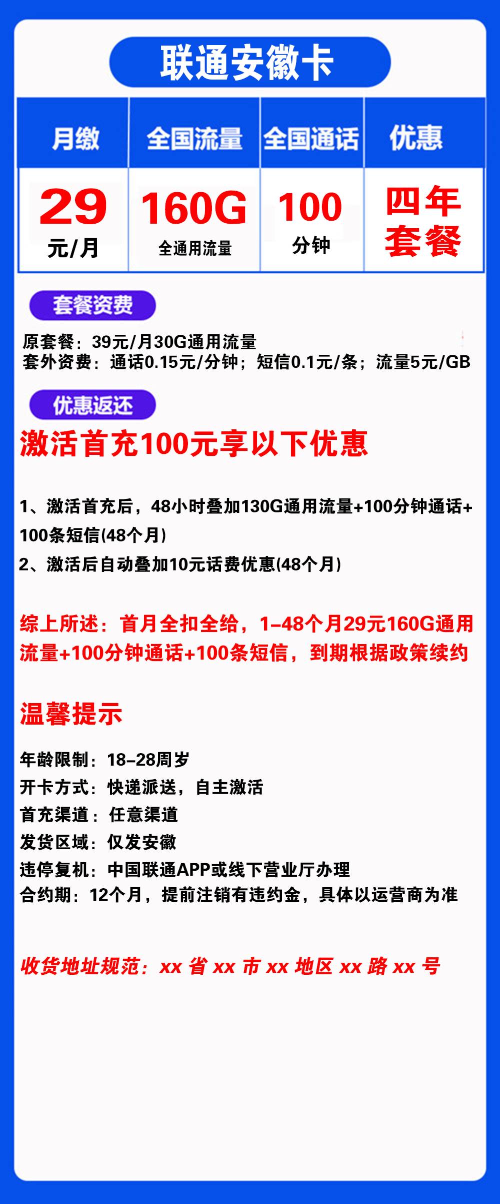 - 1-48个月:29元/月,含160G通用流量 + 100分钟通话 + 100条短信