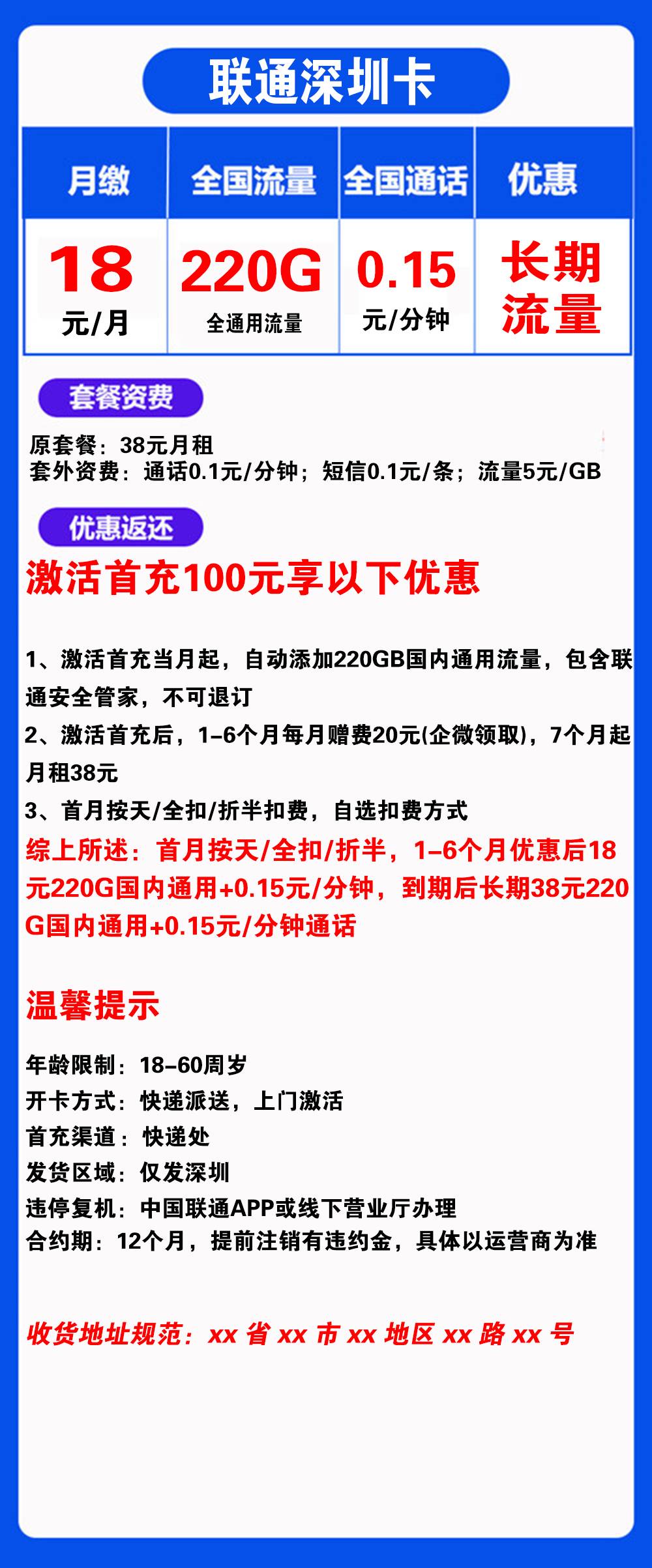 K1731/联通深圳卡18元220G流量+0.15元/分钟通话【仅发深圳】【长期流量】
