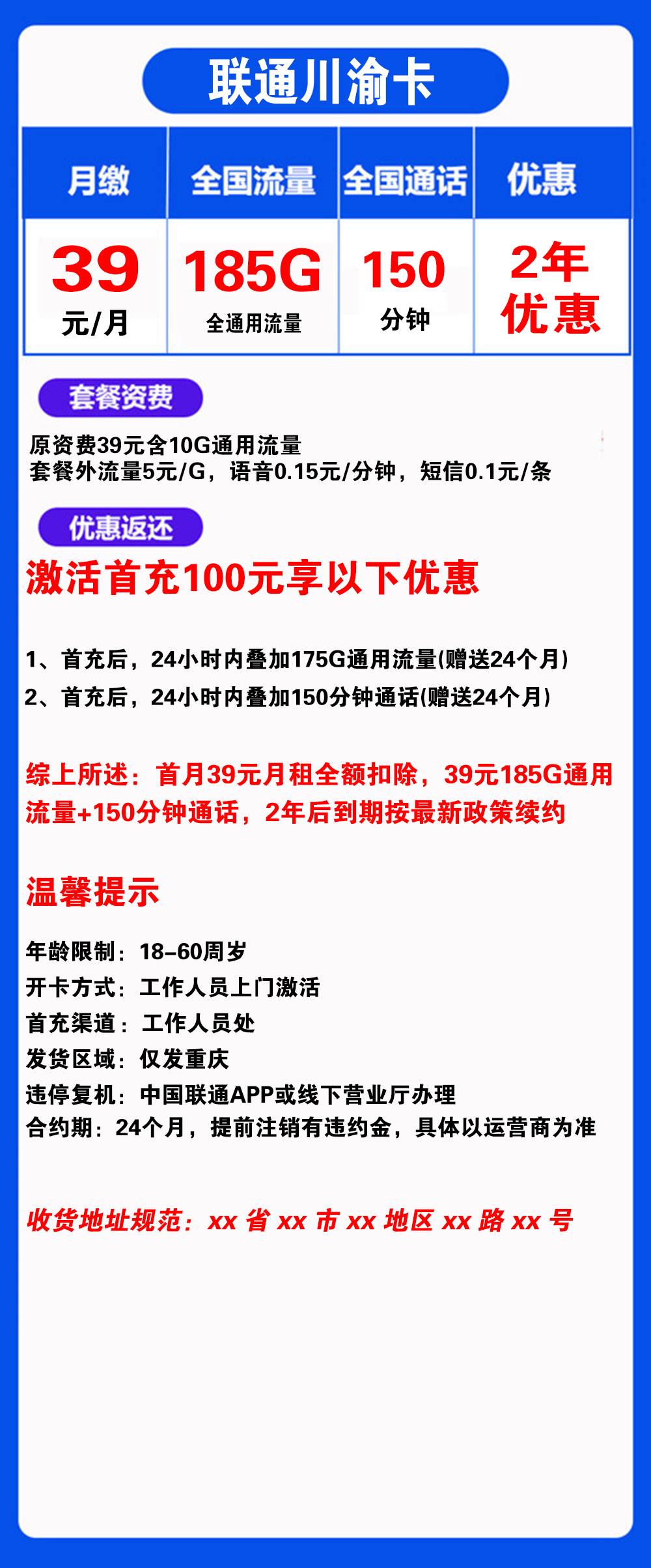 F1736/联通川渝卡39元185G流量+200分钟通话【仅发重庆】
