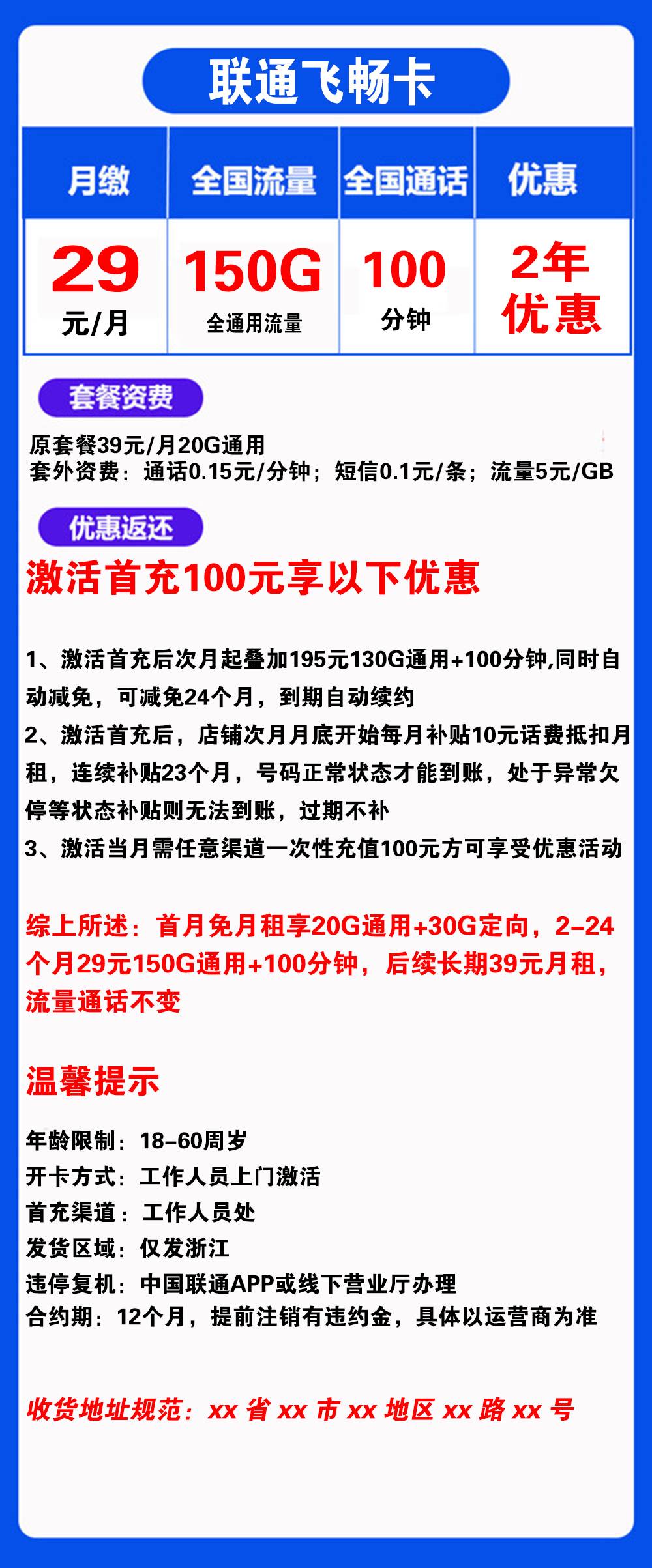 K1743/联通飞畅卡29元150G流量+100分钟通话【仅发浙江】【长期套餐】
