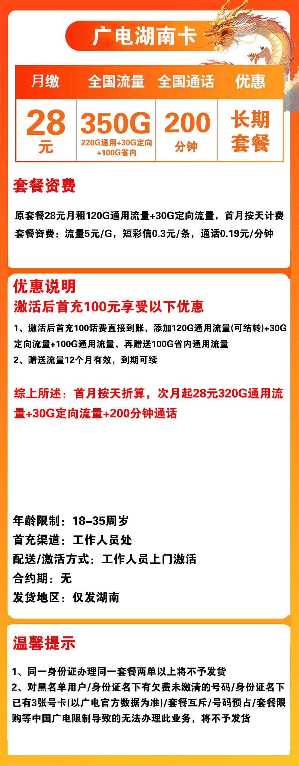 K1747/广电湖南卡28元350G流量+200分钟通话【仅发湖南】【长期套餐】