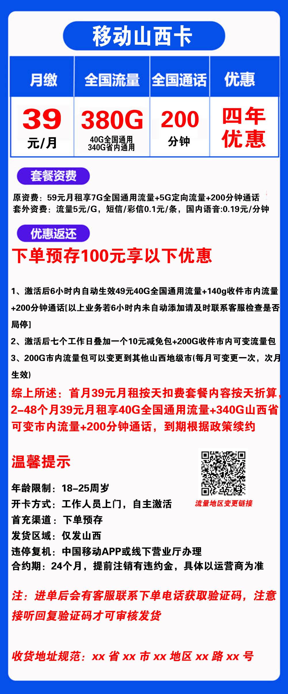 “归属地:山西”,”4年优惠”,”下单预存100元”,”自主激活”,”办卡年龄:18-25”