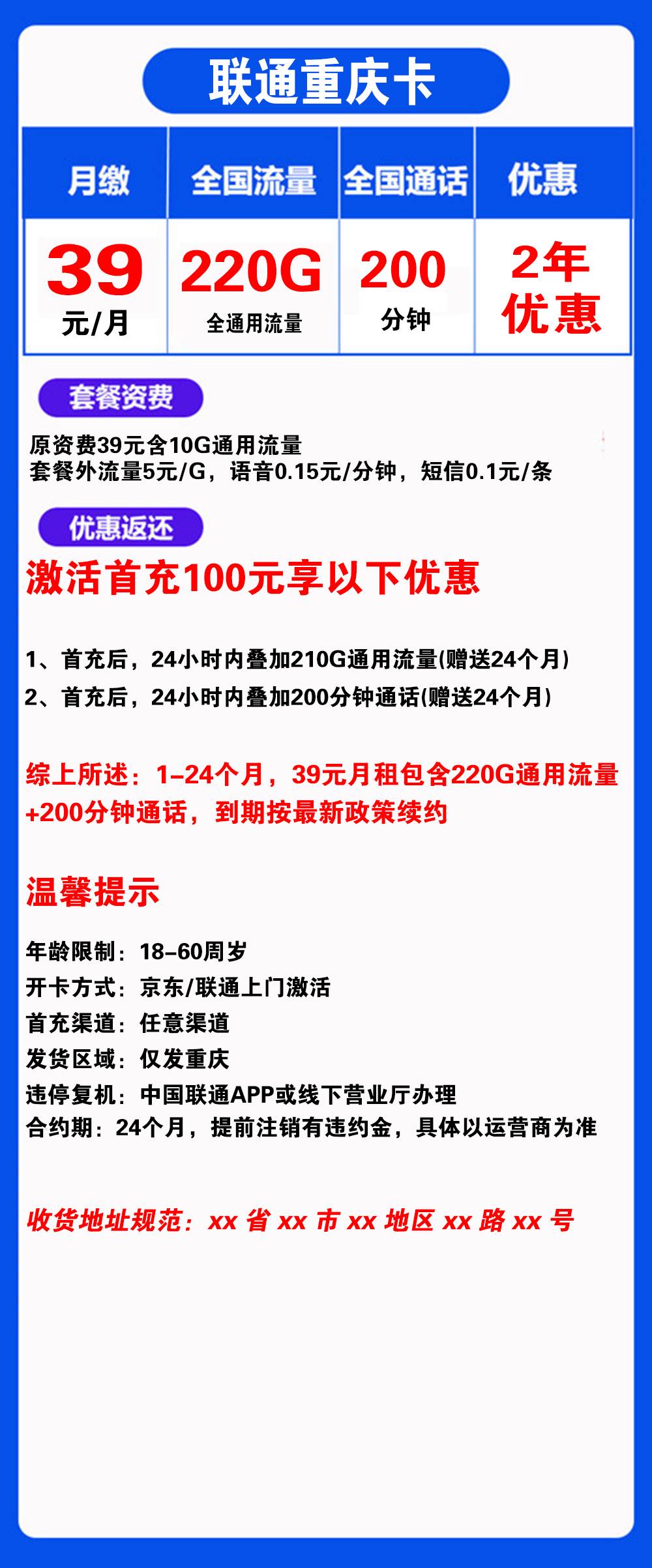 K1762/联通重庆卡39元220G流量+200分钟通话【仅发重庆】