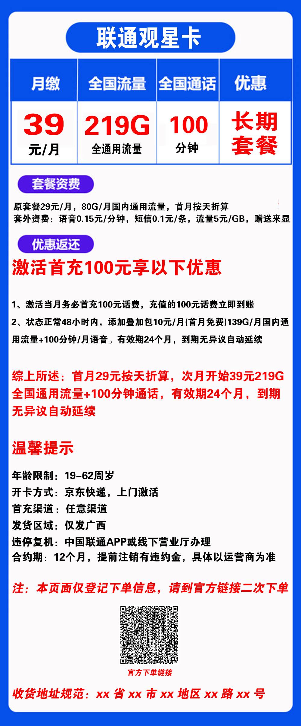 W1764/联通观星卡39元219G流量+100分钟通话【仅发广西】【长期套餐】