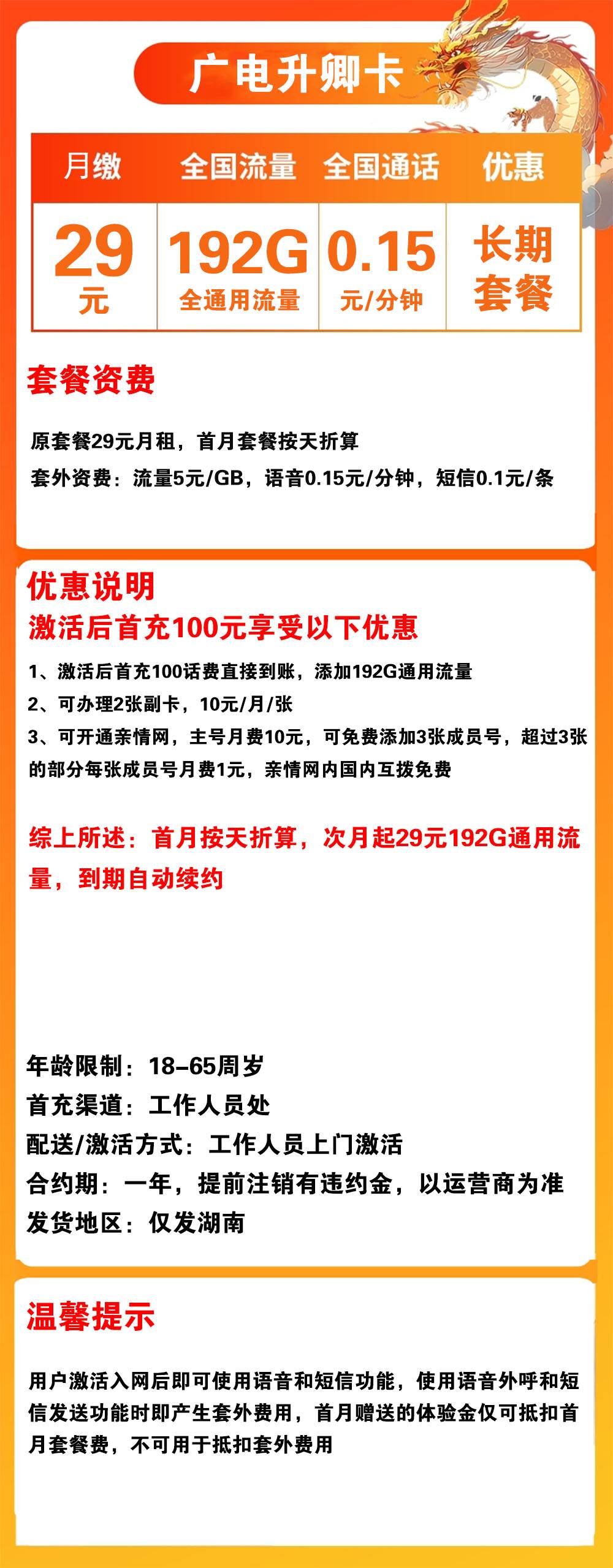 W1766/广电升卿卡29元192G流量+0.15元/分钟通话【仅发湖南】【长期套餐】