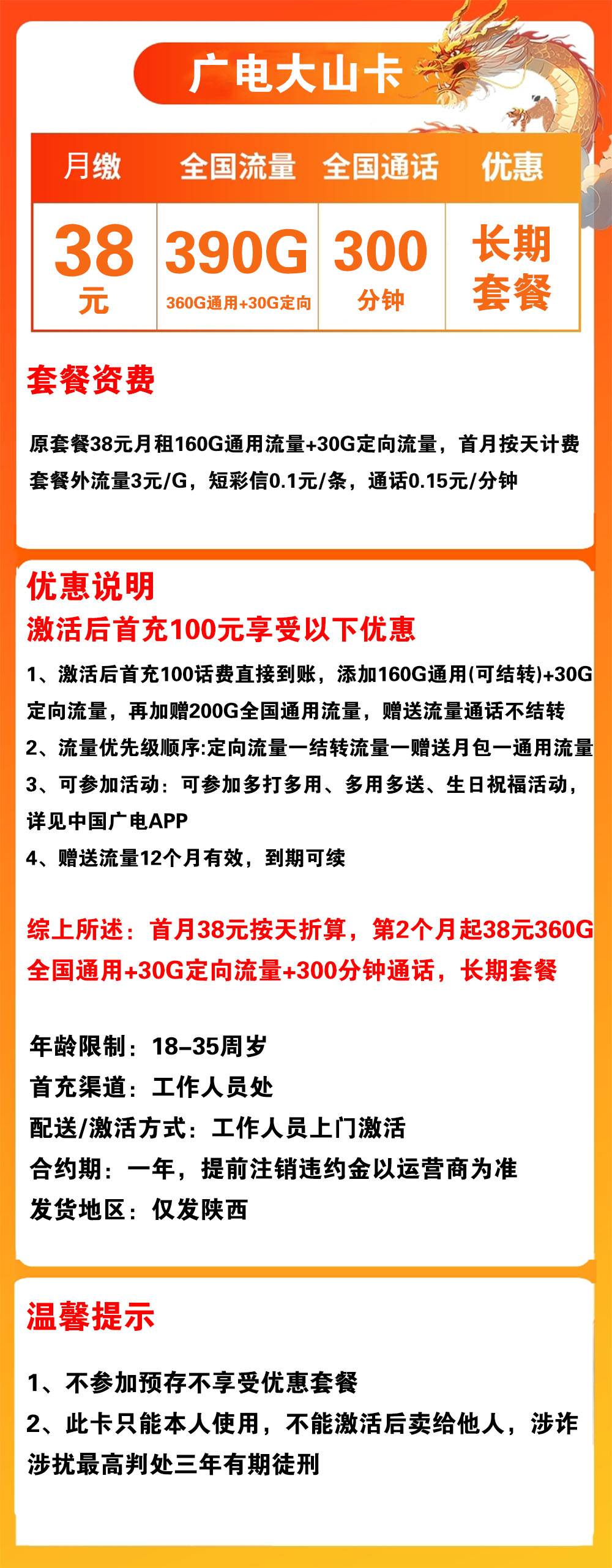 W1773/广电大山卡38元390G流量+300分钟通话【仅发陕西】【长期套餐】
