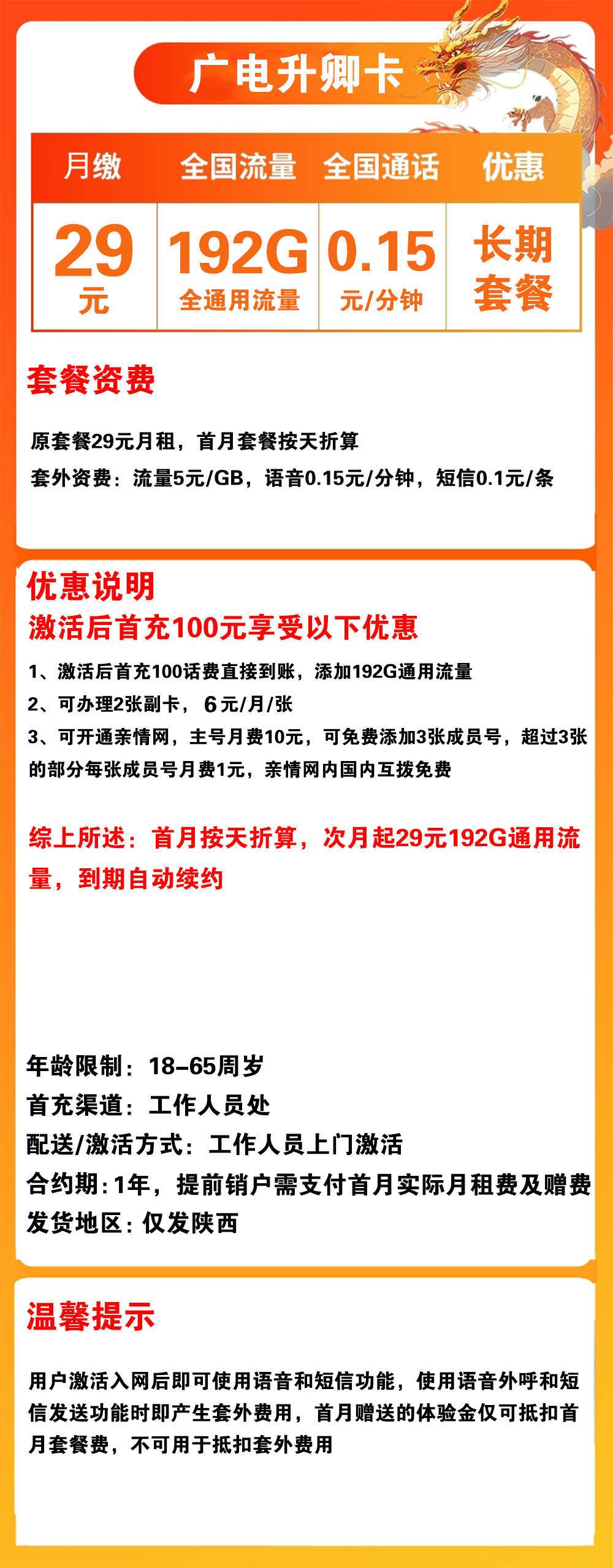 W1772/广电升卿卡29元192G流量+0.15元/分钟通话【仅发陕西】【长期套餐】