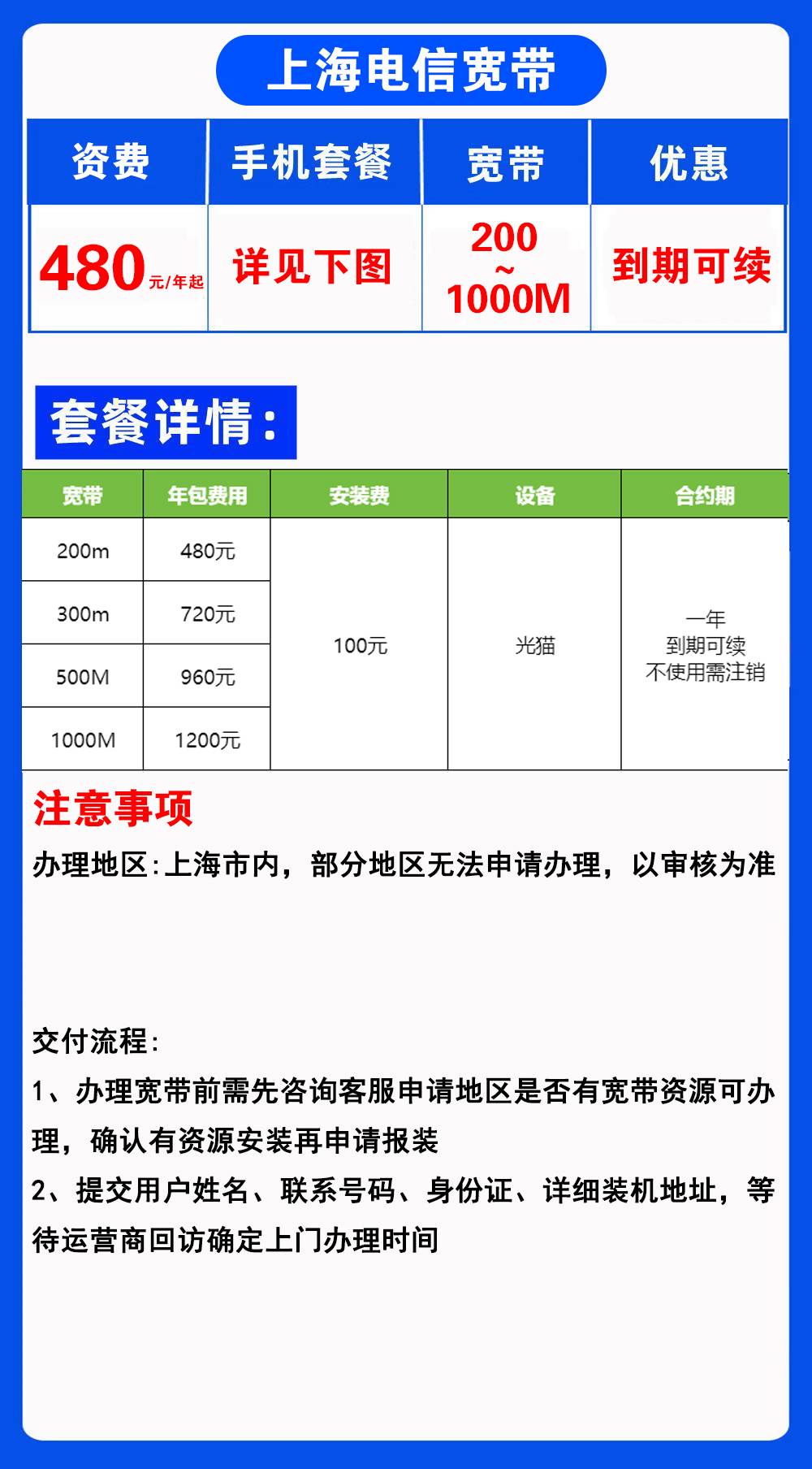 - 办理宽带前需先咨询客服,申请地区是否有宽带资源可办理,确认有资源安装再申请报装。