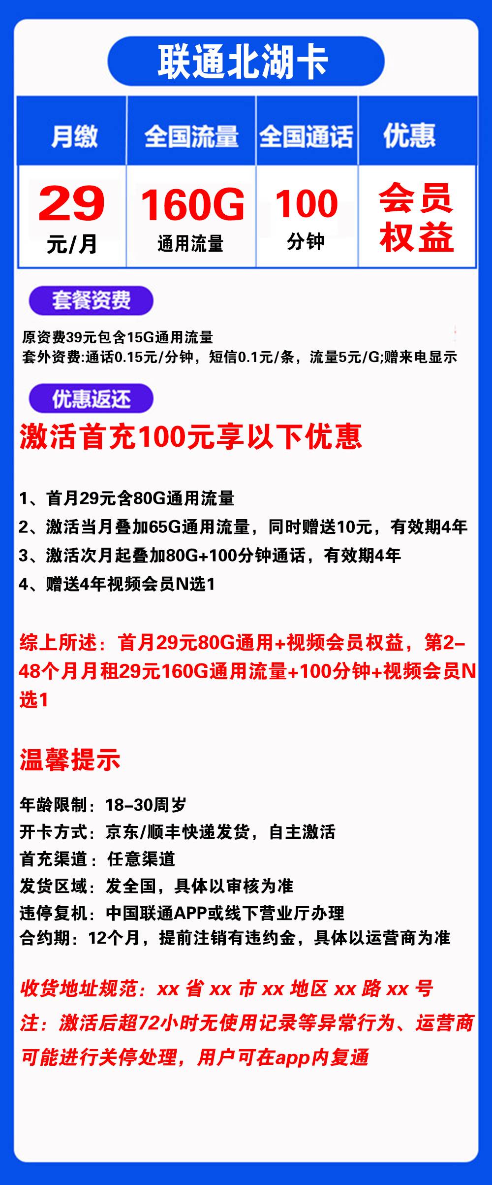 - 第2-48个月:月租29元,160G通用流量 + 100分钟 + 视频会员N选1