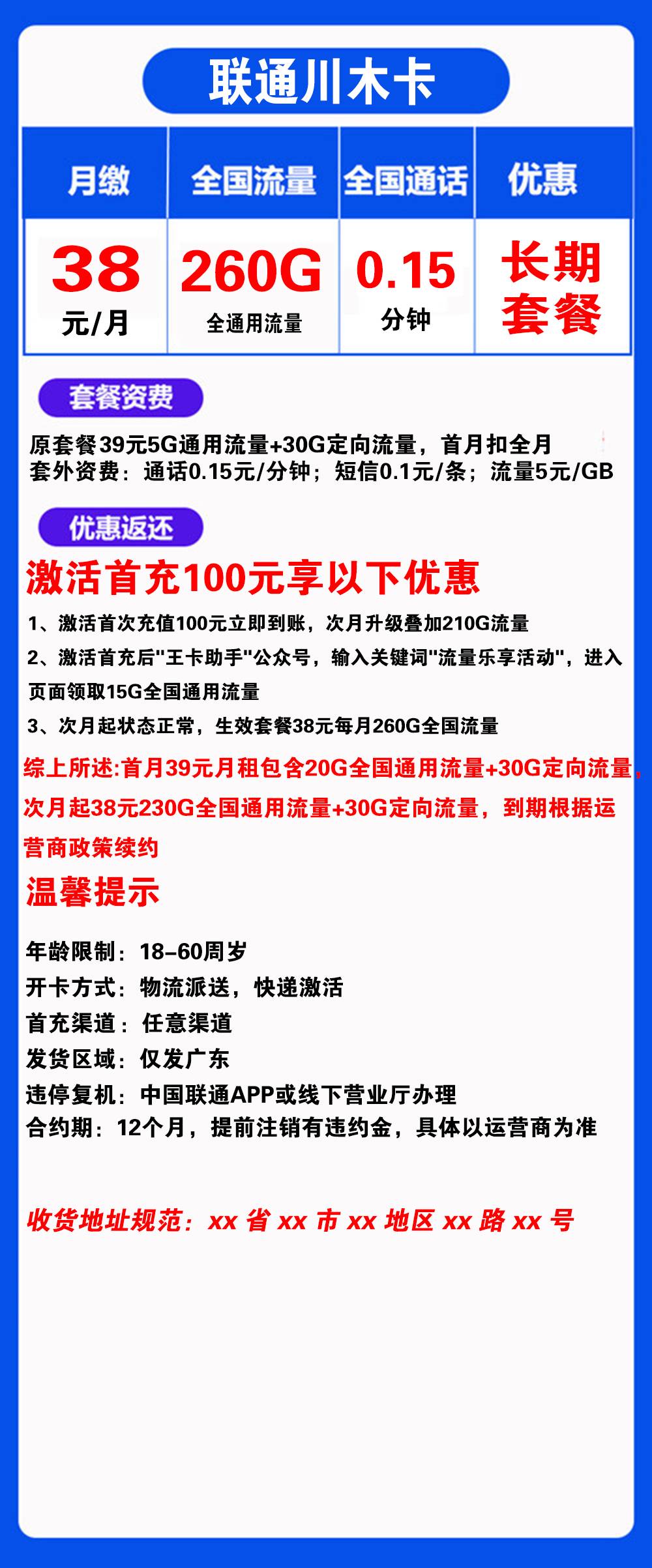 W1793/联通川木卡38元260G流量+0.15元/分钟通话【仅发广东】【长期套餐】