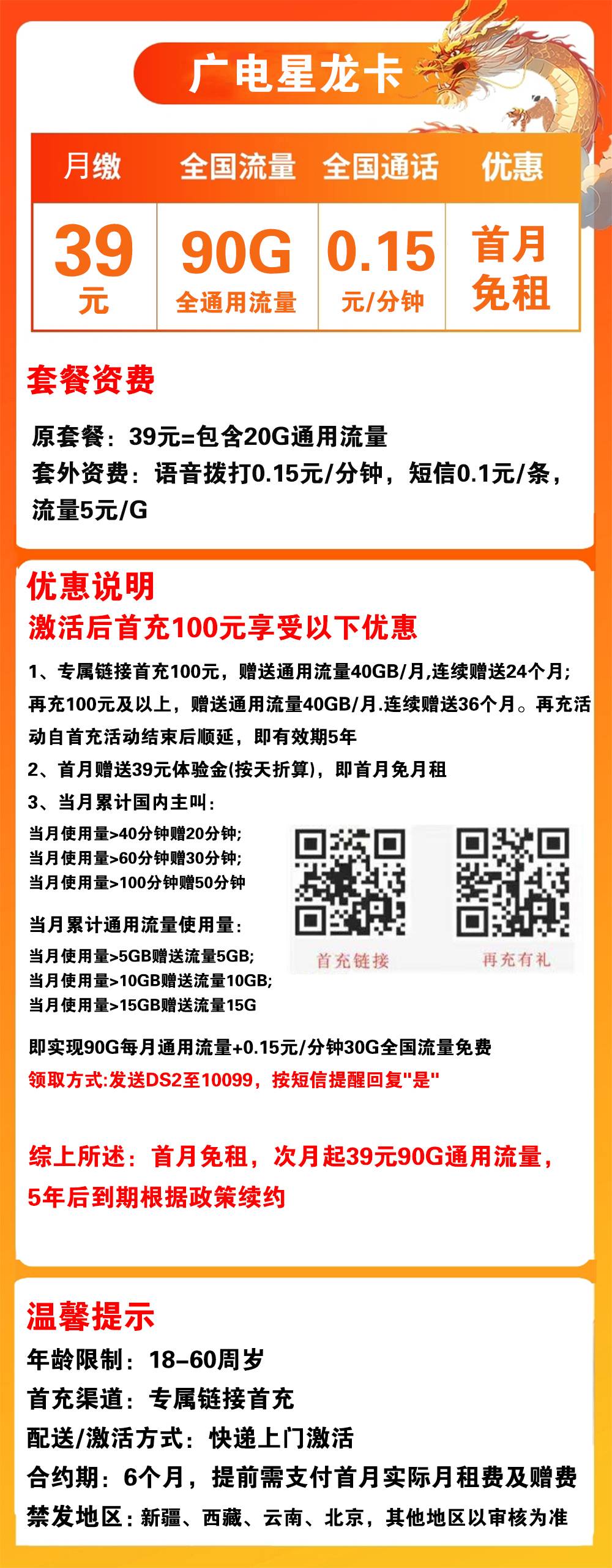 - 首月免租,次月起 39元/月,包含 90G通用流量