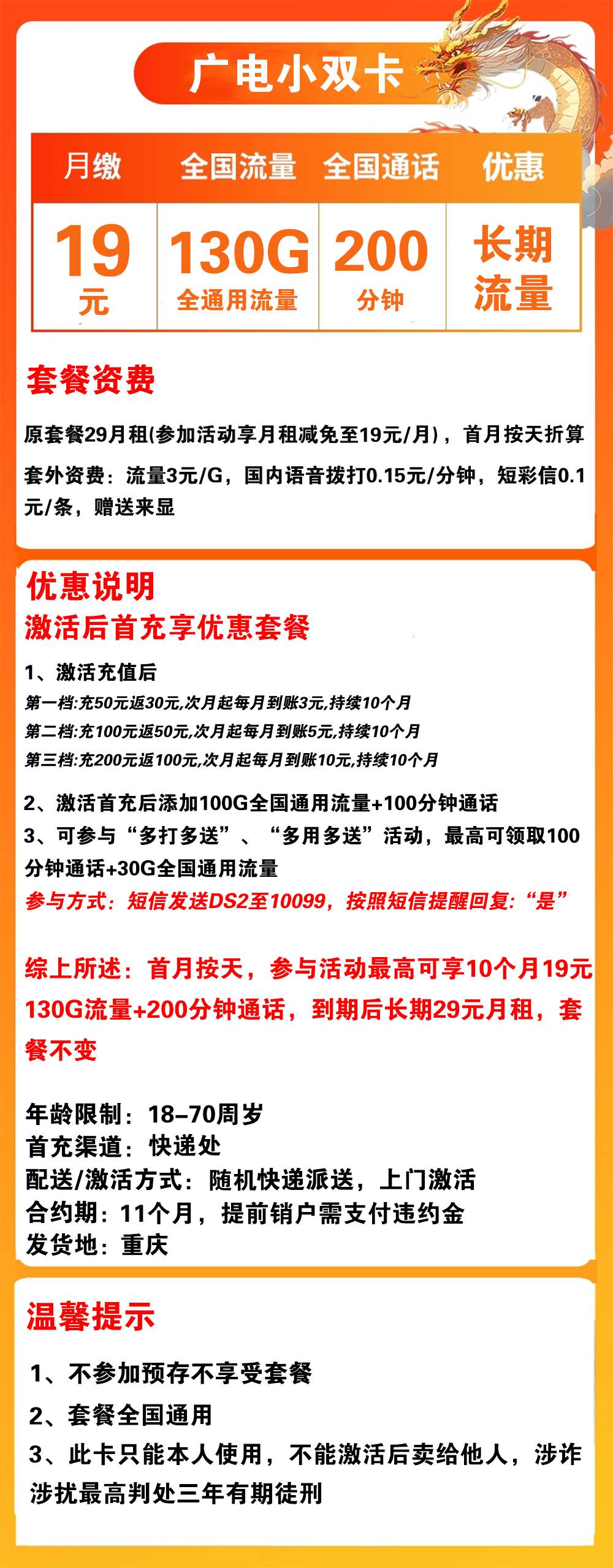 W1796/广电小双卡19元130G流量+200分钟通话【仅发重庆】【长期流量】