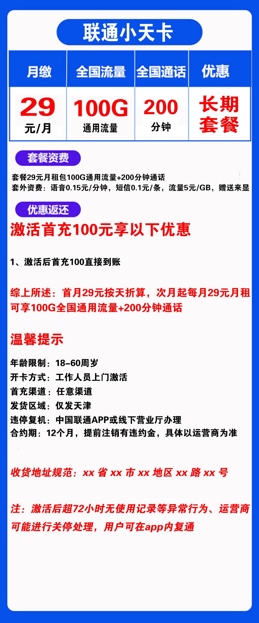- 次月起: 每月29元,享受100G全国通用流量+200分钟通话