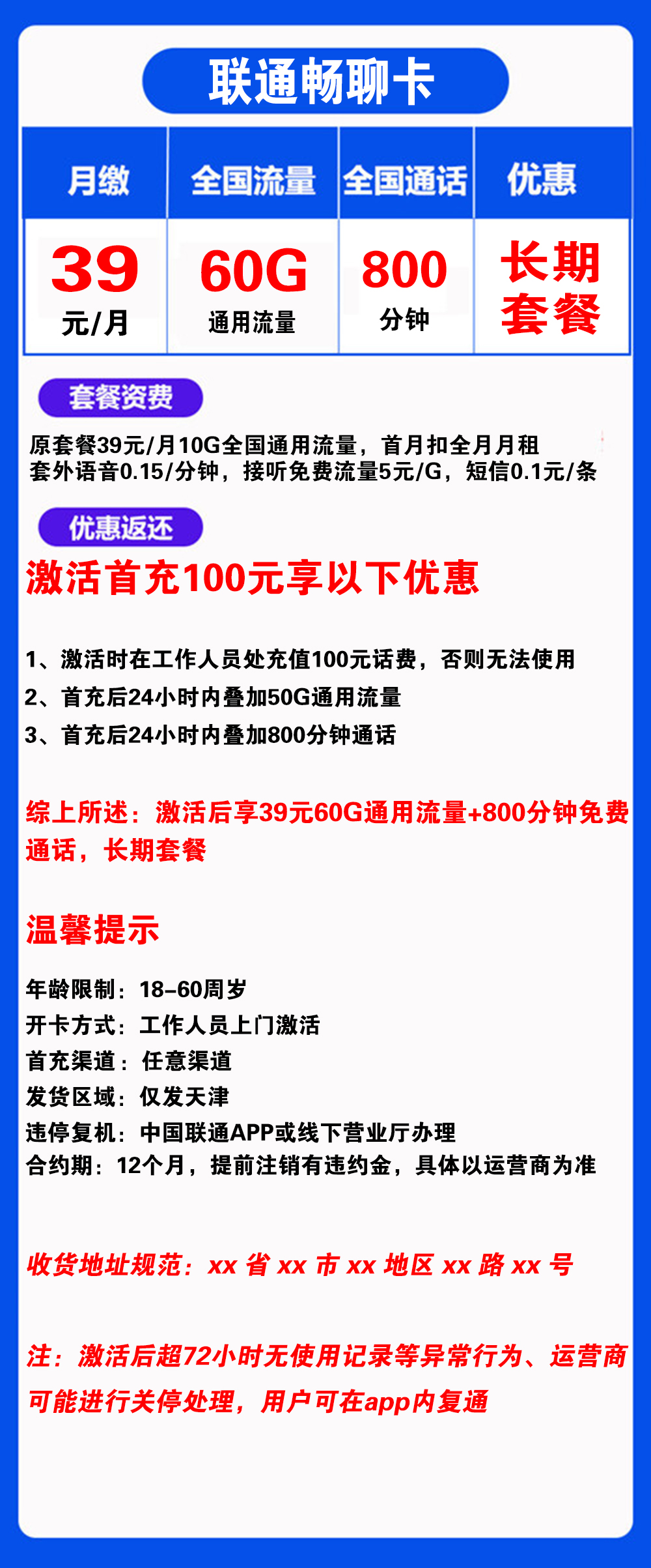 B1811/联通畅聊卡39元60G流量+800分钟通话【仅发天津】【长期套餐】
