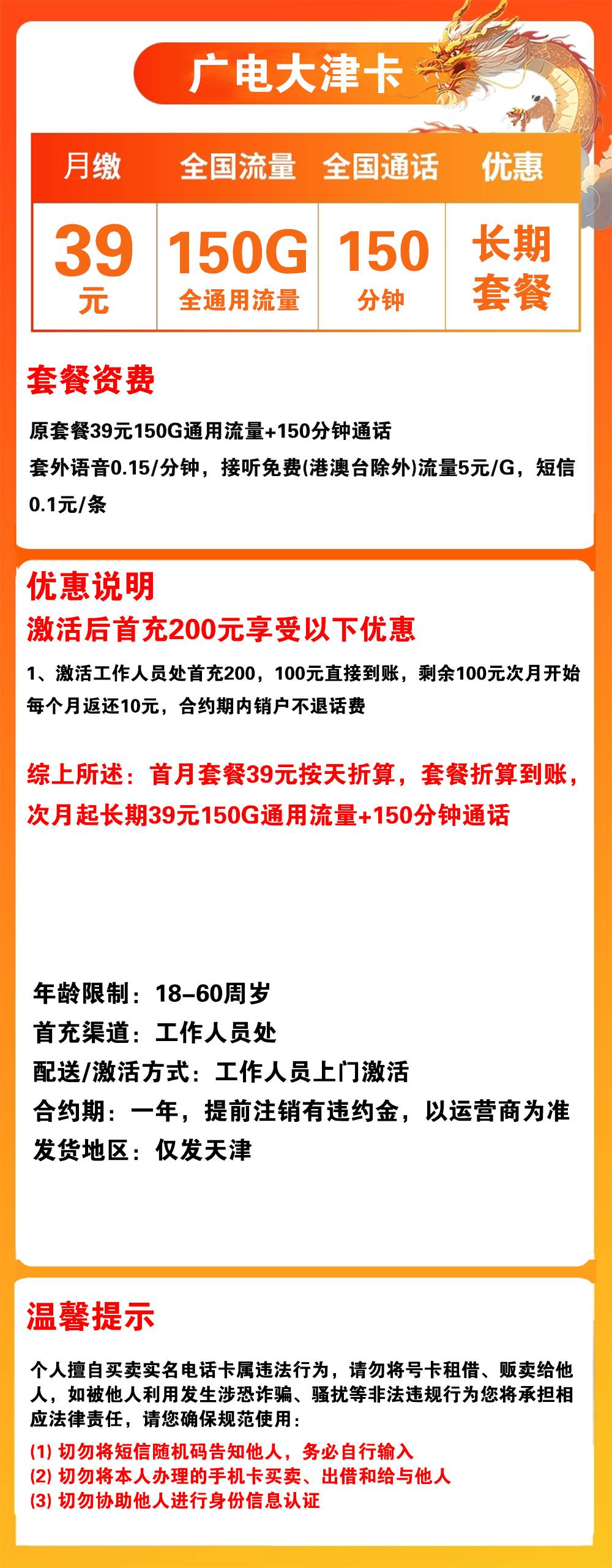 B1812/广电大津卡39元150G流量+150分钟通话【仅发天津】【长期套餐】