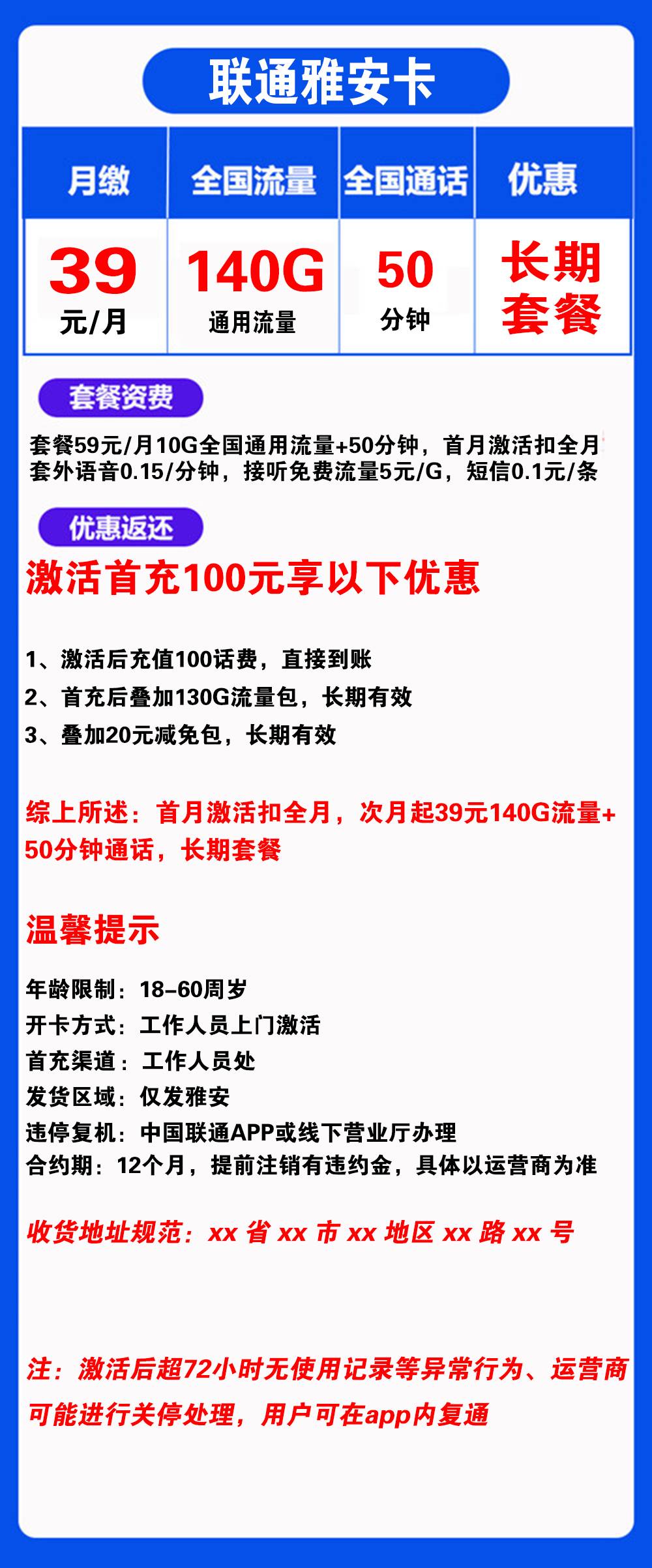B1815/联通雅安卡39元140G流量+50分钟通话【仅发雅安】【长期套餐】