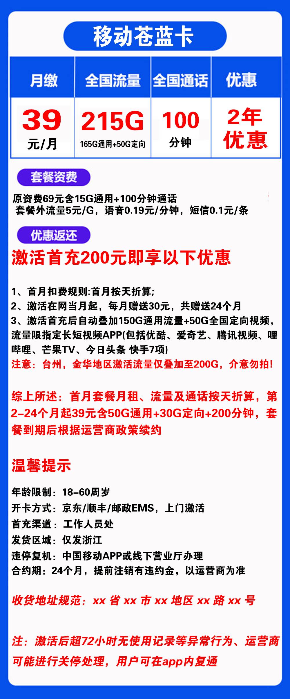 H1859/移动苍蓝卡39元215G流量+100分钟通话【仅发浙江】