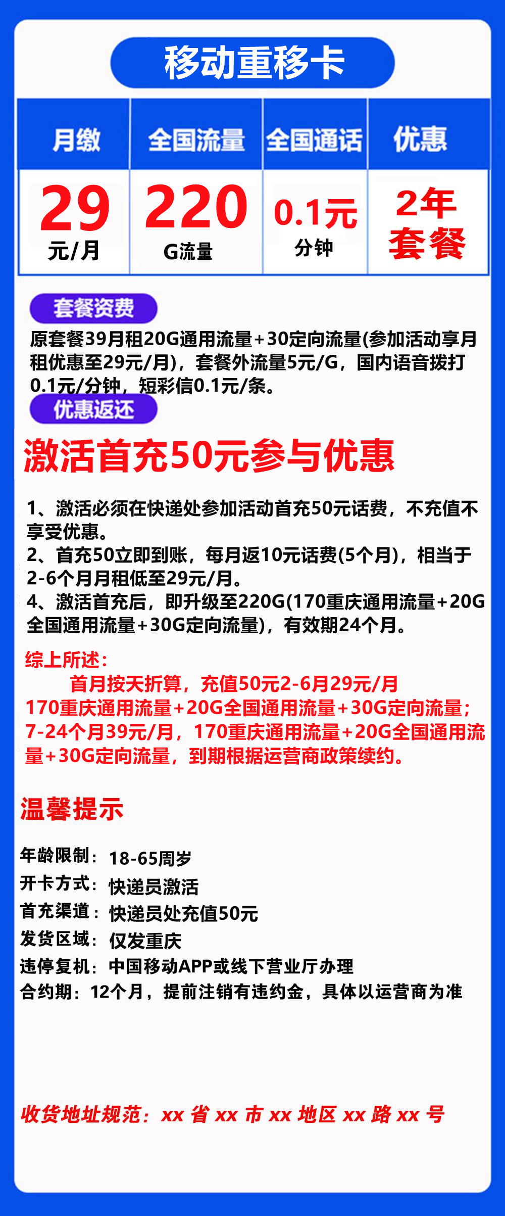 - 套餐内容:20G通用流量 + 30定向流量(参加活动享月租优惠至29元/月)