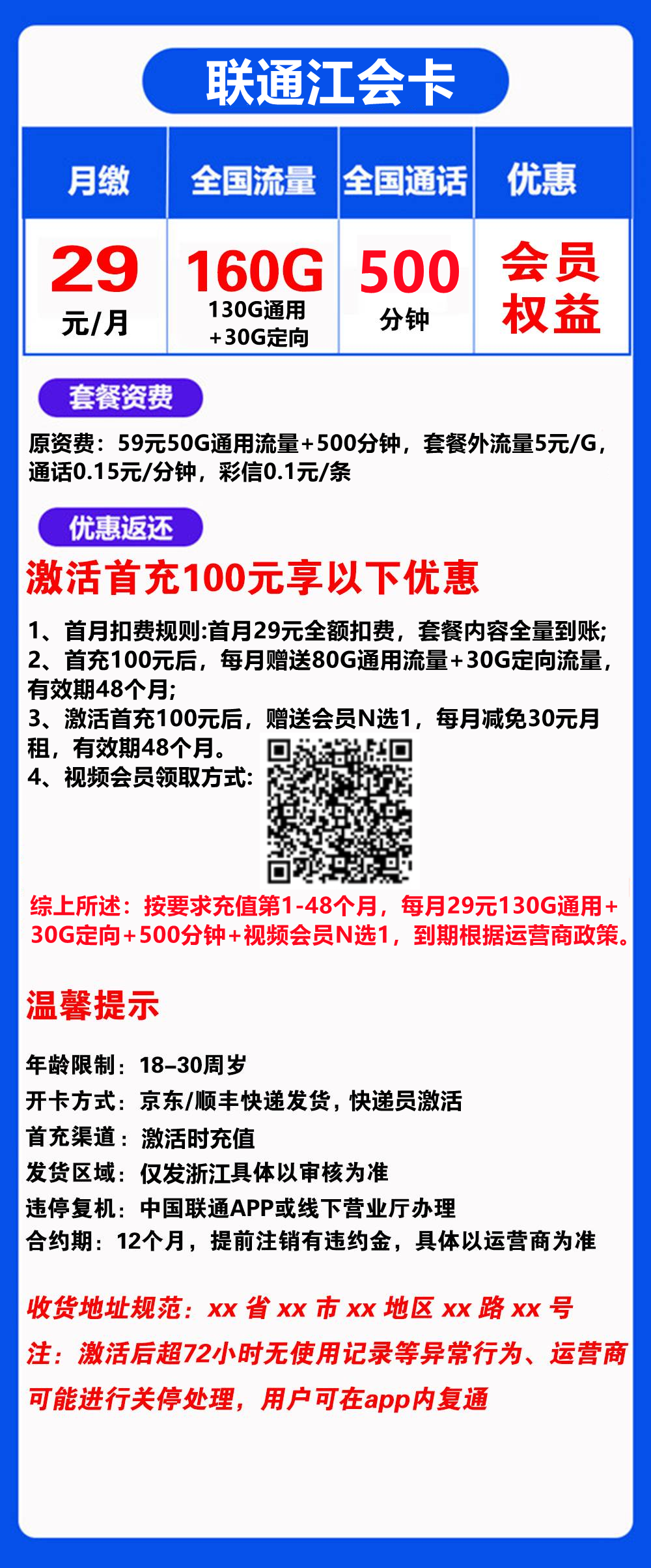 C1865/联通江会卡29元160G流量+500分钟通话【仅发浙江】