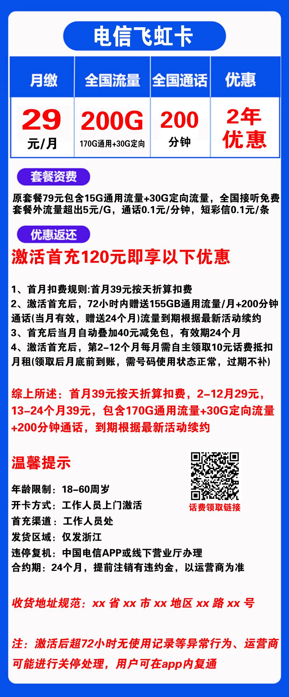 H1857/电信飞虹卡29元200G流量+200分钟通话【仅发浙江】