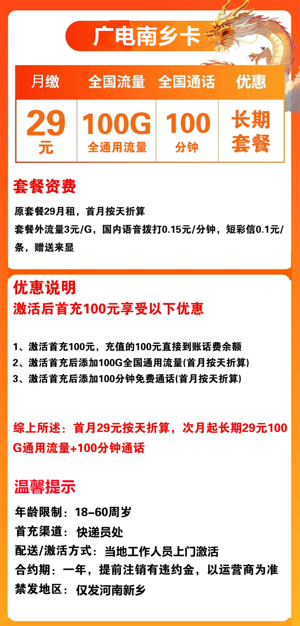 - 次月起:长期29元,包含100G通用流量 + 100分钟通话