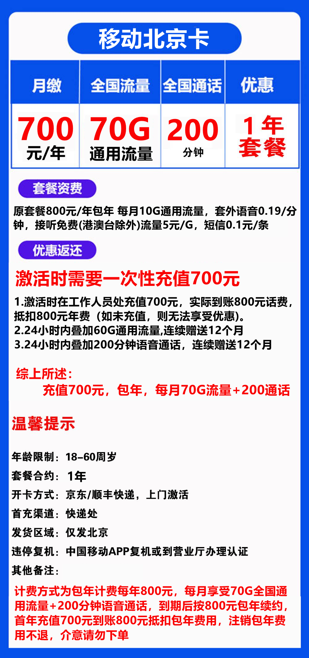 B1827/移动北京卡700元包年70G流量+200分钟通话【仅发北京】