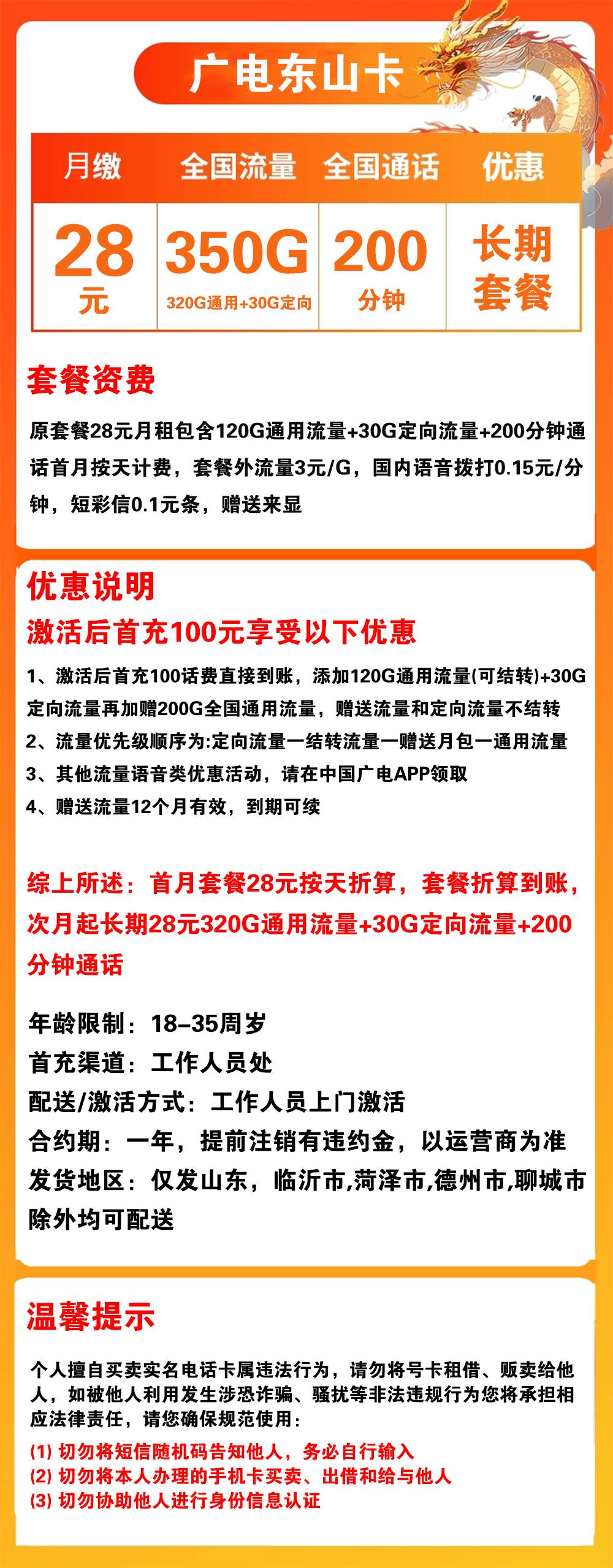 C1862/广电东山卡28元350G流量+200分钟通话【仅发山东】【长期套餐】