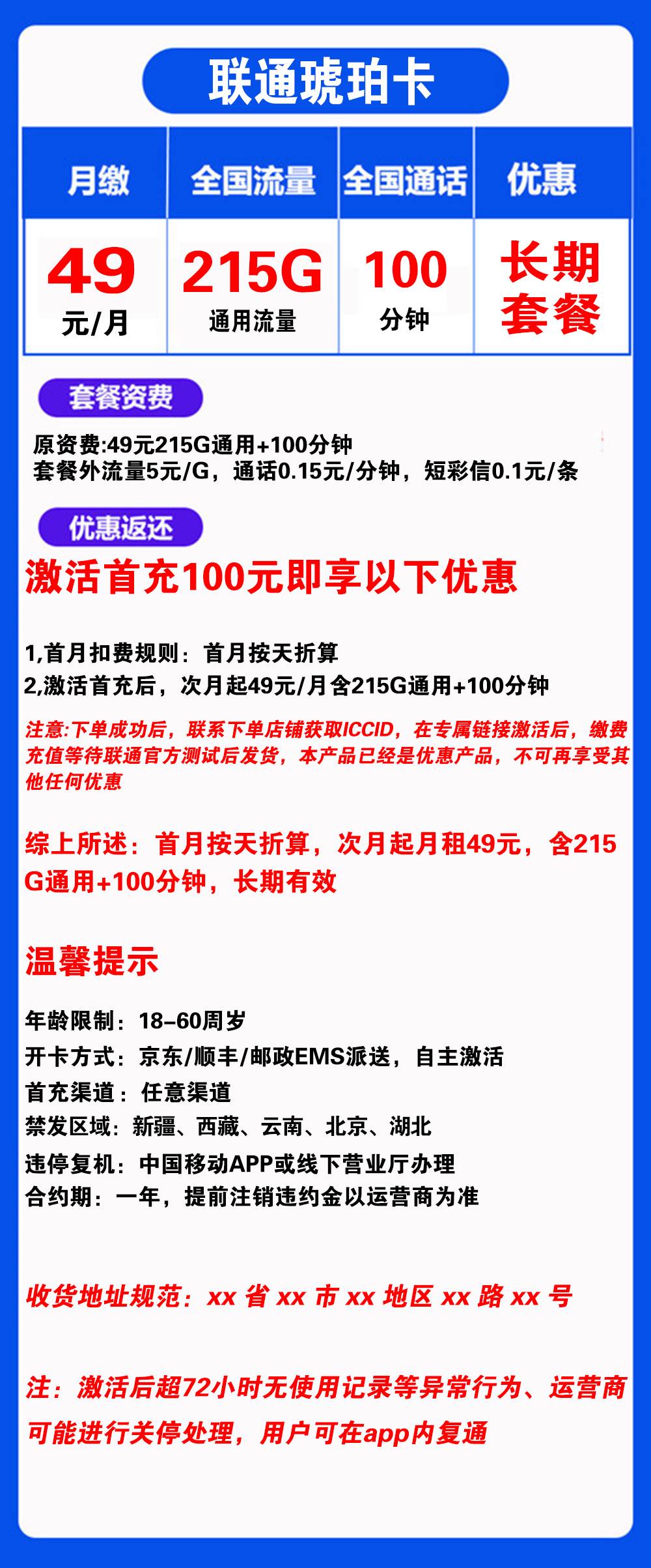 - 首月按天折算,次月起月租49元,含215G通用+100分钟,长期有效