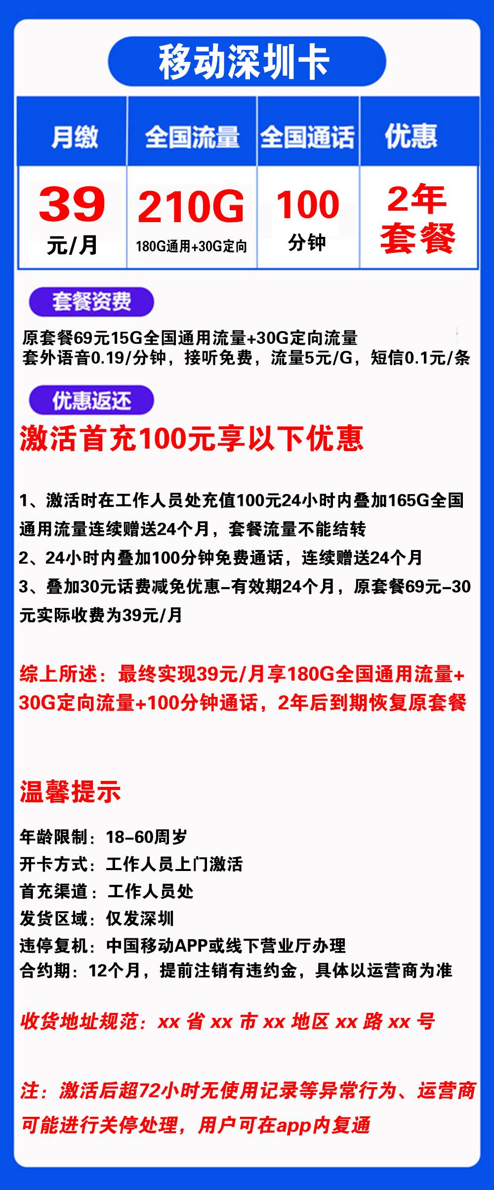 “归属地:深圳”,”只发深圳”,”2年优惠”,”上门激活选号”,”办卡年龄:18-60”