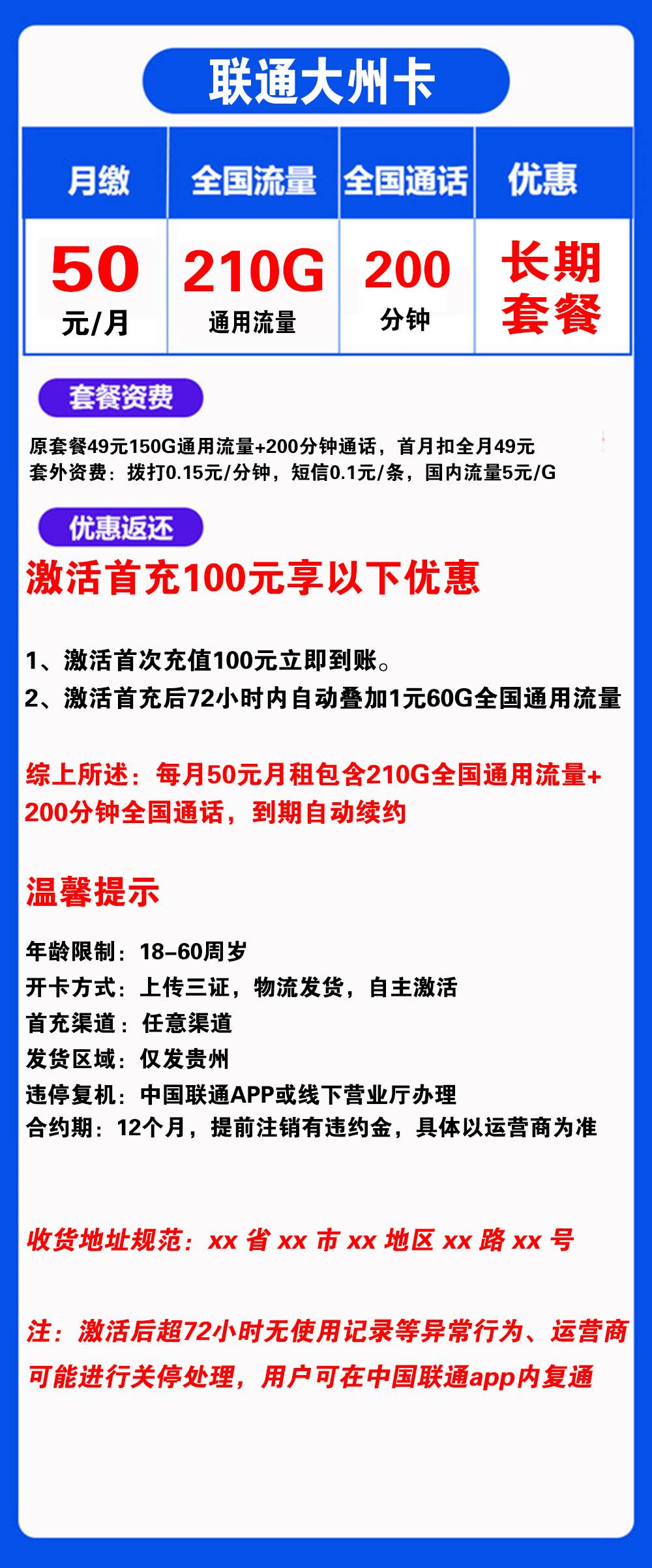 W1822/联通大州卡50元210G流量+200分钟通话【仅发贵州】【长期套餐】