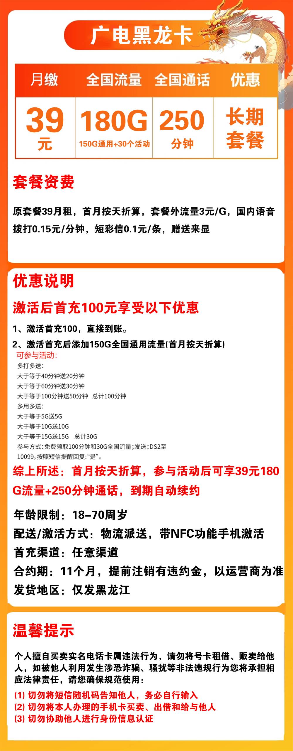 W1883/广电黑龙卡39元180G流量+250分钟通话【仅发黑龙江】【长期套餐】