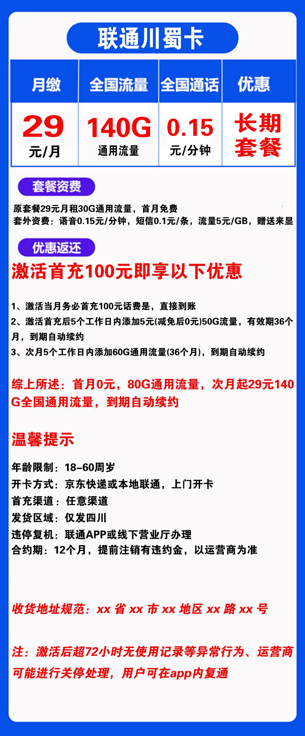 W1889/联通川蜀卡29元140G流量+0.15元/分钟通话【仅发四川】【长期套餐】