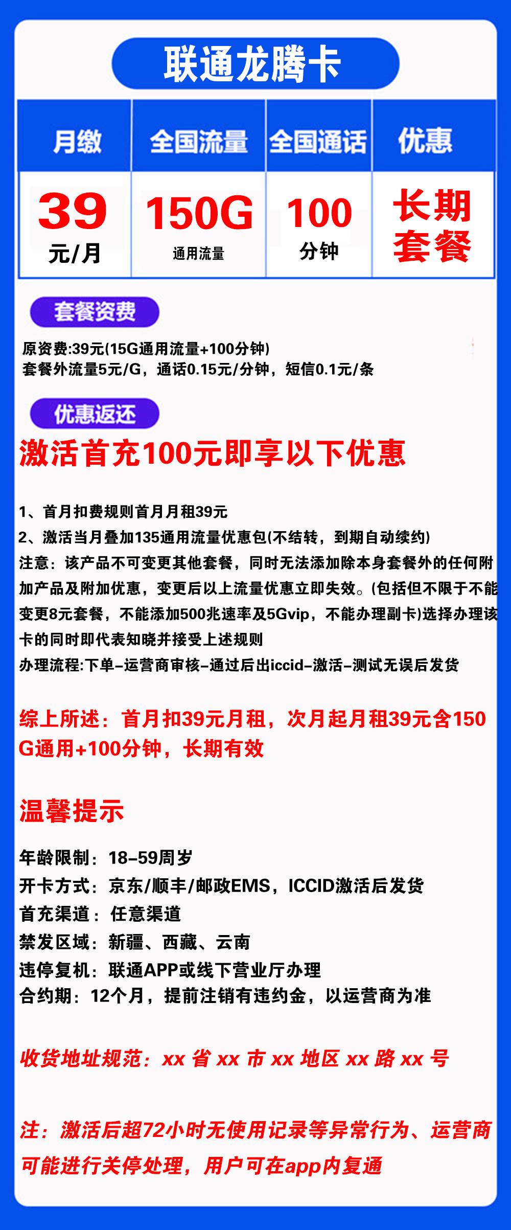 - 次月起月租39元,含150G通用流量 + 100分钟通话,长期有效
