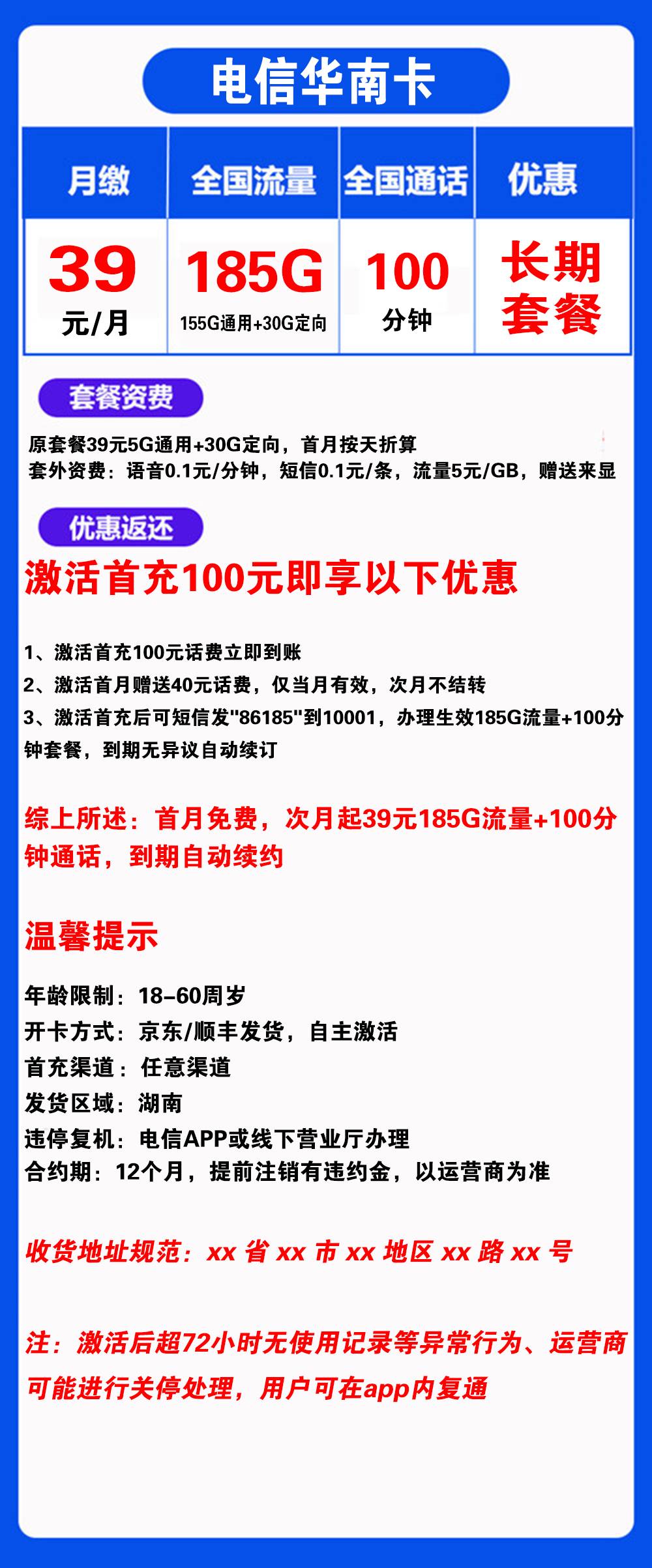 W1893/电信华南卡39元185G流量+100分钟通话【仅发湖南】【长期套餐】