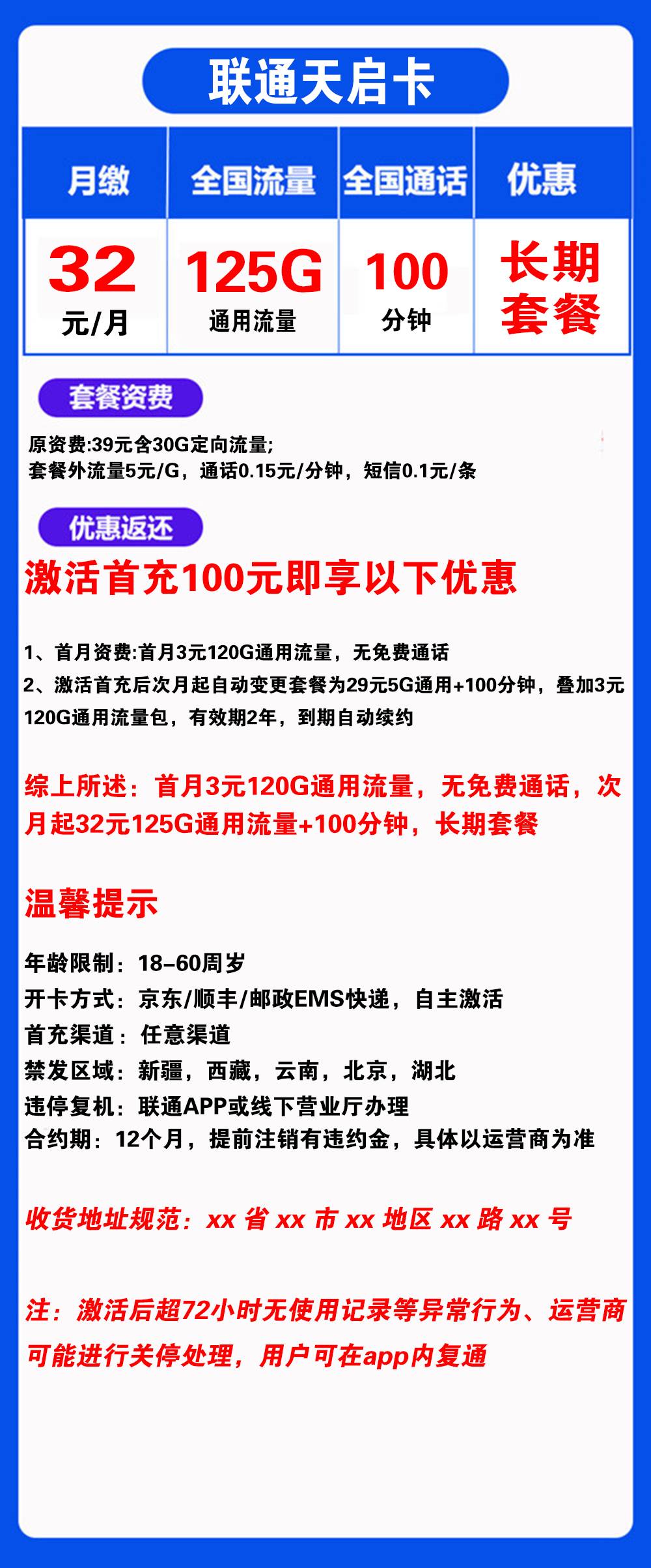 - 次月起:32元/月,含125G通用流量+100分钟通话,长期套餐