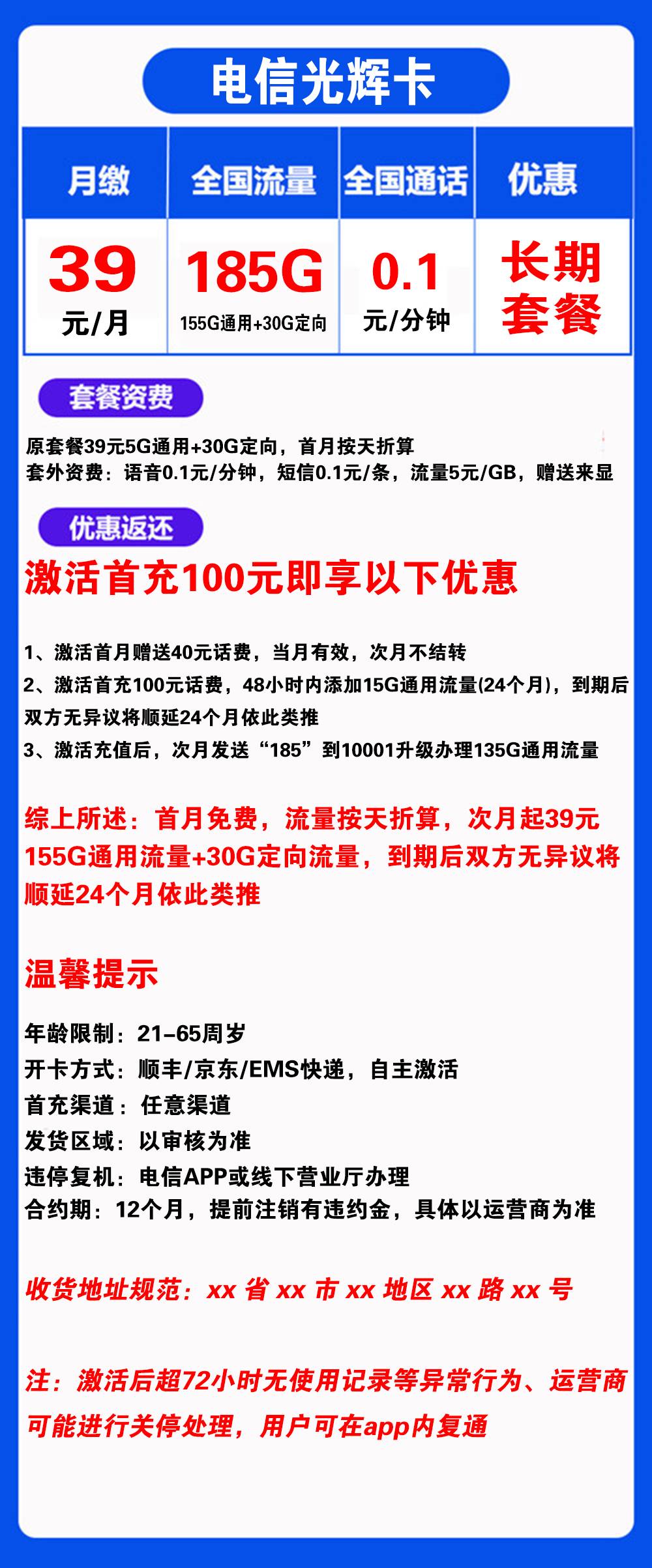 W1903/电信光辉卡39元185G流量+0.1元/分钟通话【发全国】【长期套餐】