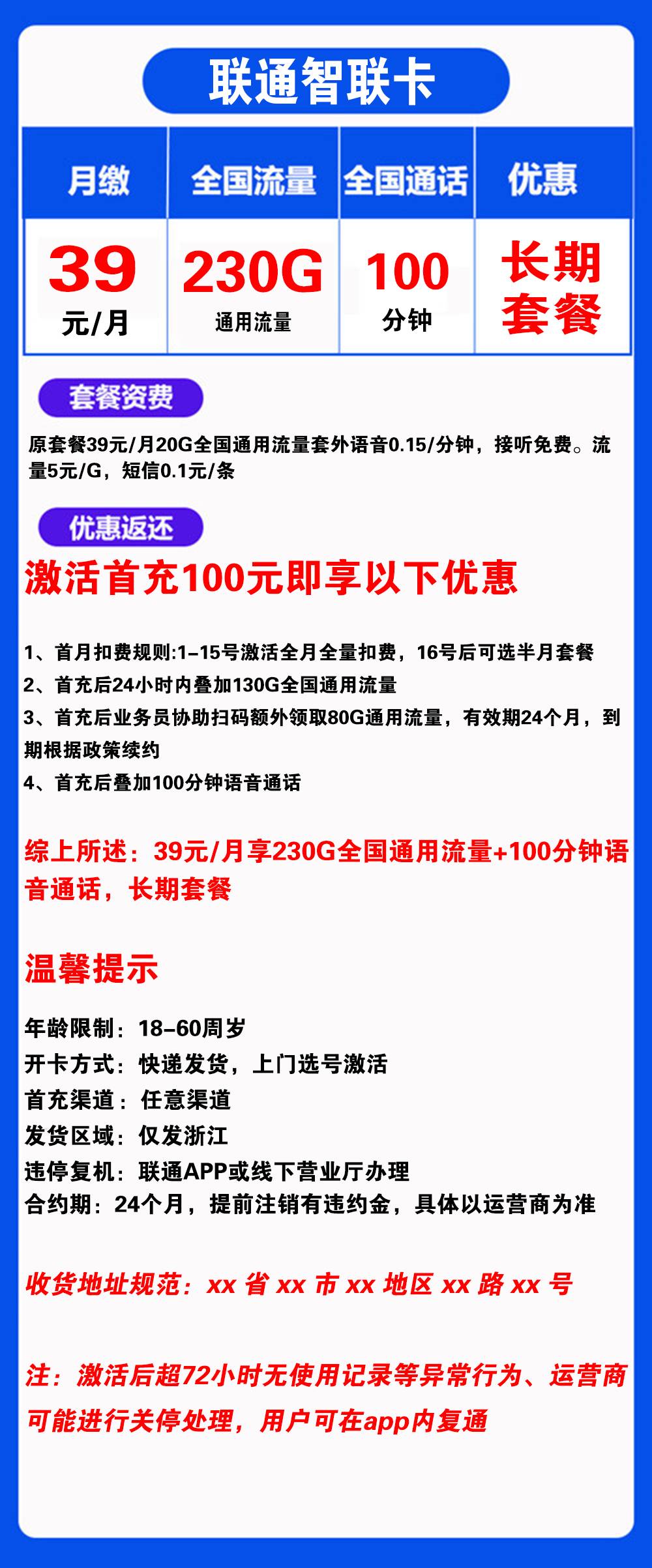 B1908/联通智联卡39元230G流量+100分钟通话【仅发浙江】【长期套餐】