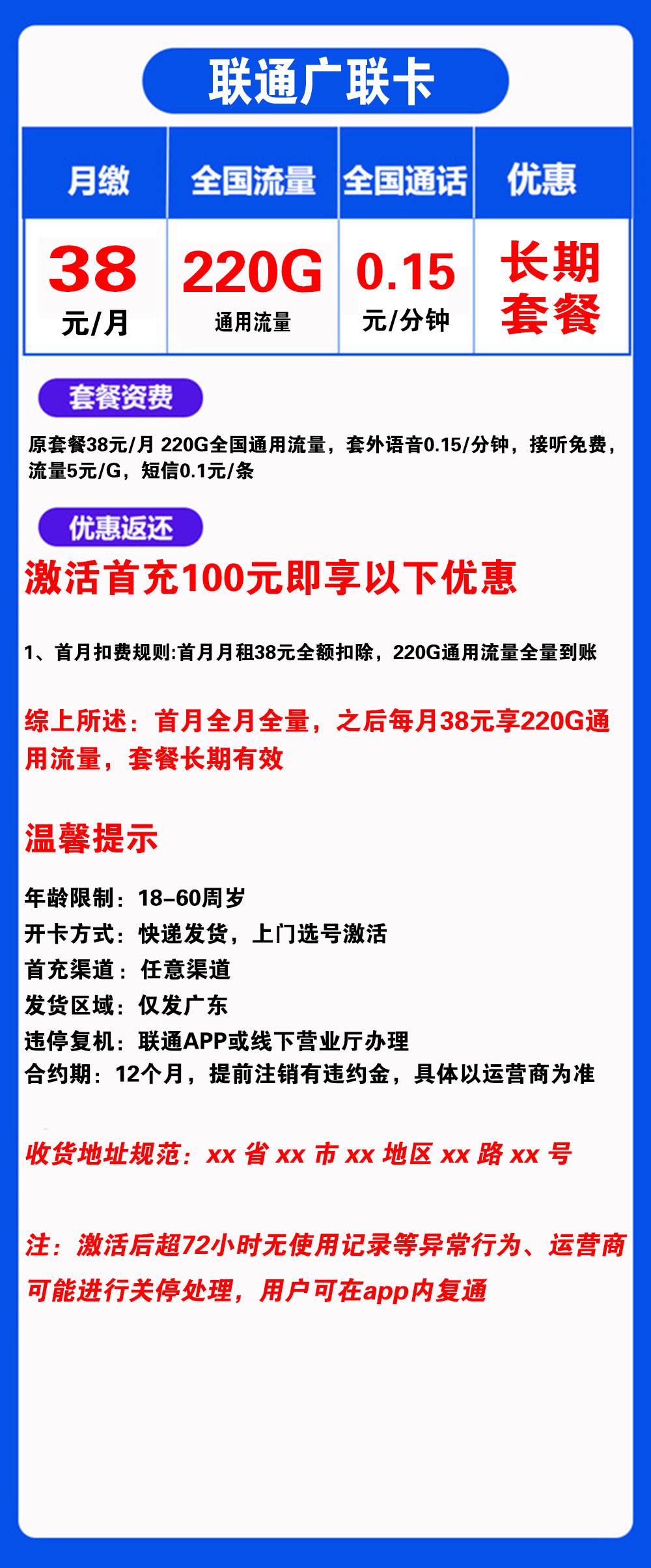 - 首月扣费规则:首月月租38元全额扣除,220G通用流量全量到账
